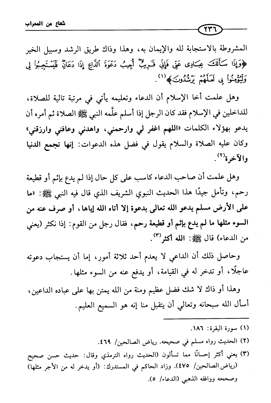 (¬3) يعني أكثر إحسانًا مما تسألون (الحديث رواه الترمذي وقال: حديث حسن صحيح (رياض الصالحين/ 475. وزاد الحاكم في المستدرك: (أو يدخر له من الأجر مثلها) وصححه ووافقه الذهبي (الدعاء/ 5).