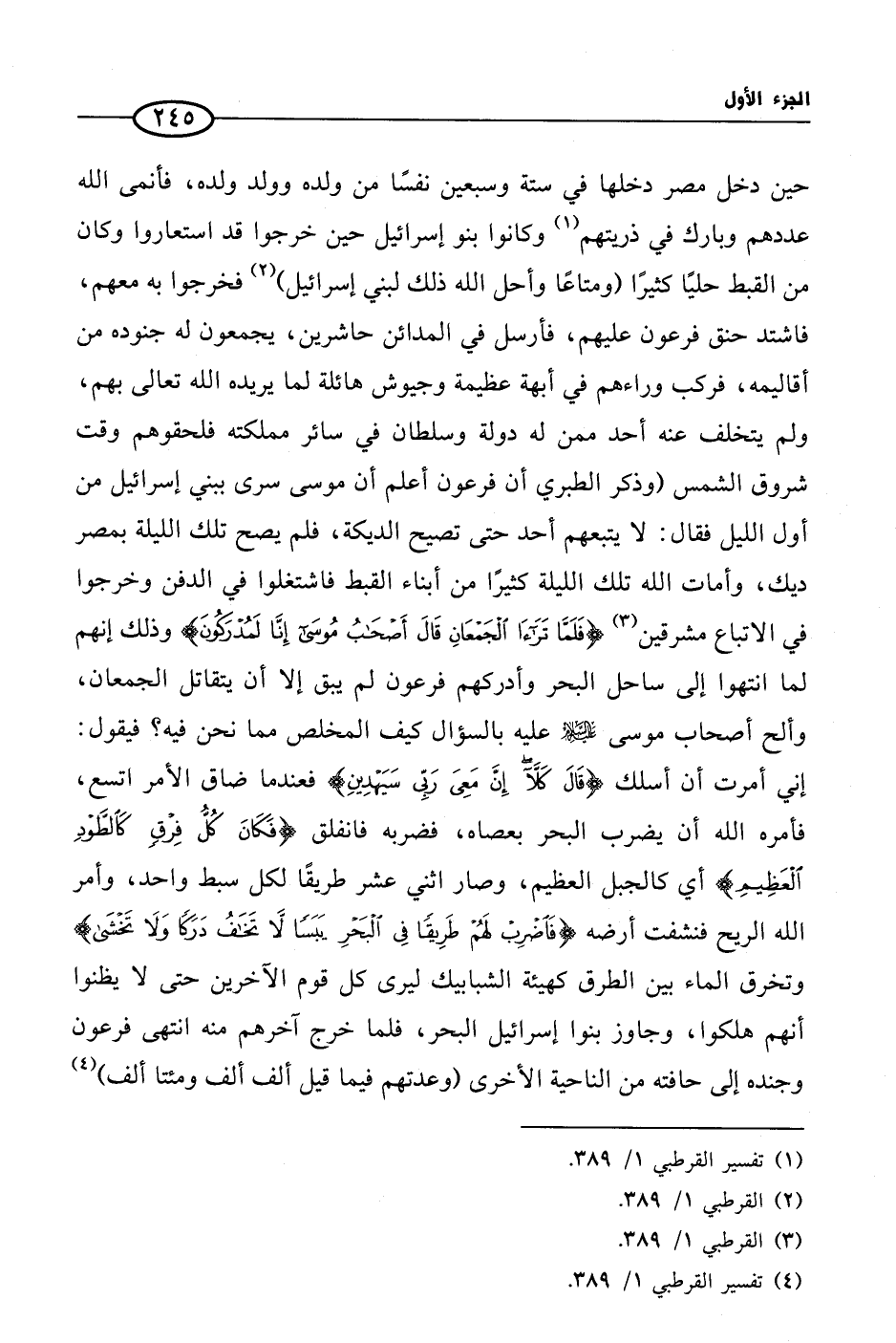 حين دخل مصر دخلها في ستة وسبعين نفسًا من ولده وولد ولده، فأنمى الله عددهم وبارك في ذريتهم (¬1) وكانوا بنو إسرائيل حين خرجوا قد استعاروا وكان من القبط حليًا كثيرًا (ومتاعًا وأحل الله ذلك لبني إسرائيل) (¬2) فخرجوا به معهم، فاشتد حنق فرعون عليهم، فأرسل في المدائن حاشرين، يجمعون له جنوده من أقاليمه، فركب وراءهم في أبهة عظيمة وجيوش هائلة لما يريده الله تعالى بهم، ولم يتخلف عنه أحد ممن له دولة وسلطان في سائر مملكته فلحقوهم وقت شروق الشمس (وذكر الطبري أن فرعون أعلم أن موسى سرى ببني إسرائيل من أول الليل فقال: لا يتبعهم أحد حتى تصيح الديكة، فلم يصح تلك الليلة بمصر ديك، وأمات الله تلك الليلة كثيرًا من أبناء القبط فاشتغلوا في الدفن وخرجوا في الاتباع مشرقين (¬3) {فلما تراءا الجمعان قال أصحاب موسى إنا لمدركون} وذلك إنهم لما انتهوا إلى ساحل البحر وأدركهم فرعون لم يبق إلا أن يتقاتل الجمعان، وألح أصحاب موسى عليه السلام عليه بالسؤال كيف المخلص مما نحن فيه؟ فيقول: إني أمرت أن أسلك {ها هنا كلا إن معي ربي سيهدين} فعندما ضاق الأمر اتسع، فأمره الله أن يضرب البحر بعصاه، فضربه فانفلق {فكان كل فرق كالطود العظيم} أي كالجبل العظيم، وصار اثني عشر طريقًا لكل سبط واحد، وأمر الله الريح فنشفت أرضه {فاضرب لهم طريقة في البحر يبسًا لا تخاف دركًا ولا تخشى} وتخرق الماء بين الطرق كهيئة الشبابيك ليرى كل قوم ألاخرين حتى لا يظنوا أنهم هلكوا، وجاوز بنوا إسرائيل البحر، فلما خرج آخرهم منه انتهى فرعون وجنده إلى حافته من الناحية الأخرى (وعدتهم فيما قيل ألف ألف ومئتا ألف) (¬4)