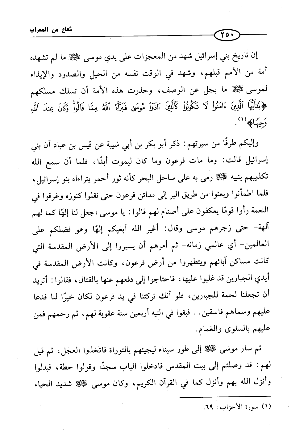 إن تاريخ بني إسرائيل شهد من المعجزات على يدي موسى عليه السلام ما لم تشهده أمة من الأمم قبلهم، وشهد في الوقت نفسه من الحيل والصدود والإيذاء لموسى عليه السلام ما يجل عن الوصف، وحذرت هذه الأمة أن تسلك مسلكهم {يا أيها الذين آمنوا لا تكونوا كالذين آذوا موسى فبرأه الله مما قالوا وكان عند الله وجيهًا} (¬1).