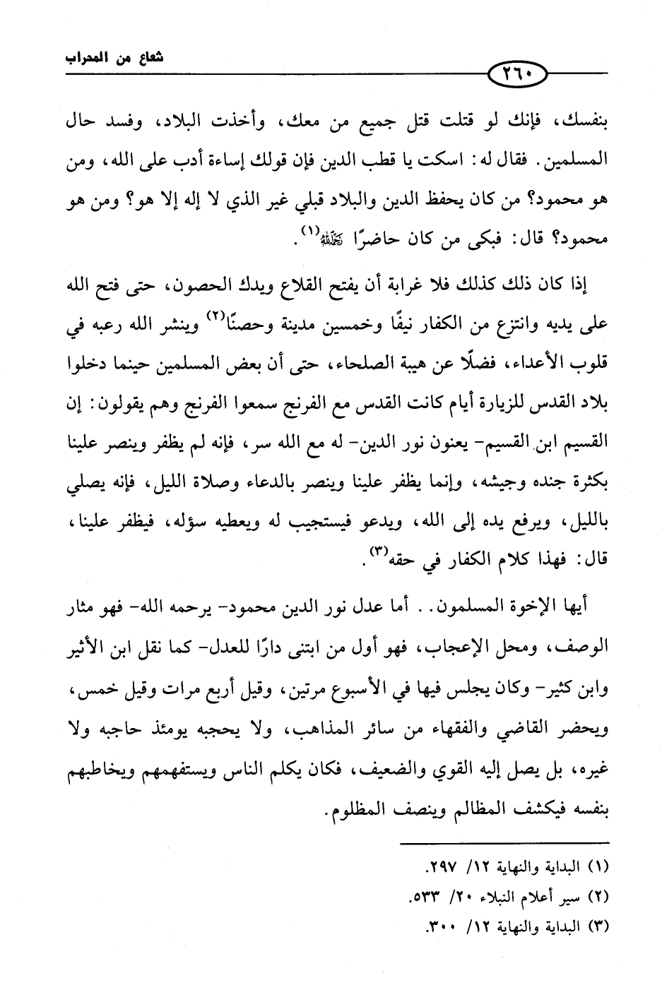 إذا كان ذلك كذلك فلا غرابة أن يفتح القلاع ويدك الحصون، حتى فتح الله على يديه وانتزع من الكفار نيفًا وخمسين مدينة وحصنًا (¬2) وينشر الله رعبه في قلوب الأعداء، فضلاً عن هيبة الصلحاء، حتى أن بعض المسلمين حينما دخلوا بلاد القدس للزيارة أيام كانت القدس مع الفرنج سمعوا الفرنج وهم يقولون: إن القسيم ابن القسيم- يعنون نور الدين- له مع الله سر، فإنه لم يظفر وينصر علينا بكثرة جنده وجيشه، وإنما يظفر علينا وينصر بالدعاء وصلاة الليل، فإنه يصلي بالليل، ويرفع يده إلى الله، ويدعو فيستجيب له ويعطيه سؤله، فيظفر علينا، قال: فهذا كلام الكفار في حقه (¬3).