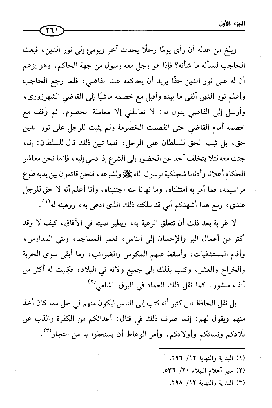 وبلغ من عدله أن رأى يومًا رجلاً يحدث آخر ويومئ إلى نور الدين، فبعث الحاجب ليسأله ما شأنه؟ فإذا هو رجل معه رسول من جهة الحاكم، وهو يزعم أن له على نور الدين حقًا يريد أن يحاكمه عند القاضي، فلما رجع الحاجب وأعلم نور الدين ألقى ما بيده وأقبل مع خصمه ماشيًا إلى القاضي الشهرزوري، وأرسل إلى القاضي يقول له: لا تعاملني إلا معاملة الخصوم. ثم وقف مع خصمه أمام القاضي حتى انفصلت الخصومة ولم يثبت للرجل على نور الدين حق، بل ثبت الحق للسلطان على الرجل، فلما تبين ذلك قال للسلطان: إنما جئت معه لئلا يتخلف أحد عن الحضور إلى الشرع إذا دعي إليه، فإنما نحن معاشر الحكام أعلانا وأدنانا شجنكية لرسول الله صلى الله عليه وسلم ولشرعه، فنحن قائمون بين يديه طوع مراسيمه، فما أمر به امتثلناه، وما نهانا عنه اجتنبناه، وأنا أعلم أنه لا حق للرجل عندي، ومع هذا أشهدكم أني قد ملكته ذلك الذي ادعى به، ووهبته له (¬1).
