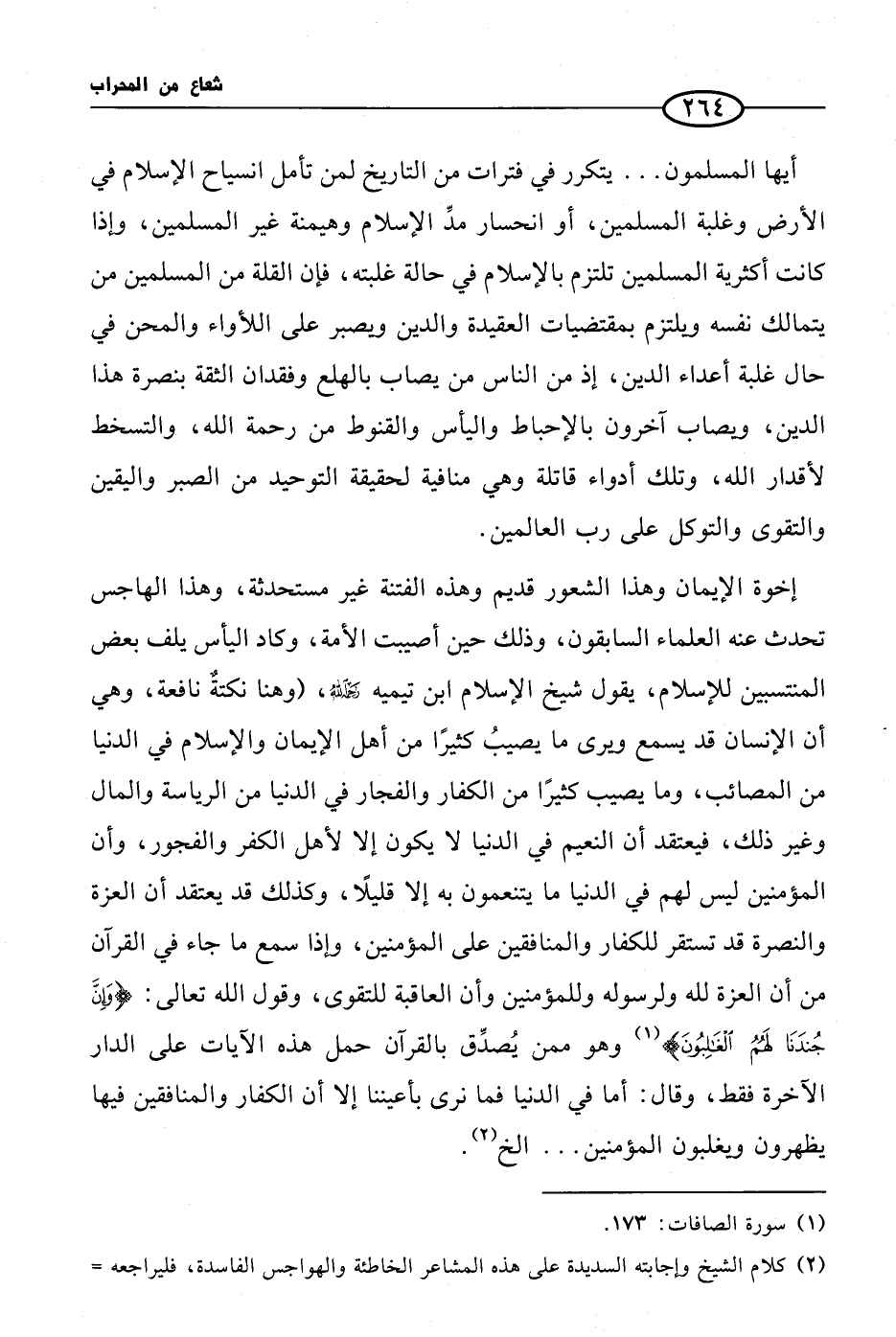 إخوة الإيمان وهذا الشعور قديم وهذه الفتنة غير مستحدثة، وهذا الهاجس تحدث عنه العلماء السابقون، وذلك حين أصيبت الأمة، وكاد اليأس يلف بعض المنتسبين للإسلام، يقول شيخ الإسلام ابن تيميه رحمه الله، (وهنا نكتةٌ نافعة، وهي أن الإنسان قد يسمع ويرى ما يصيبُ كثيرًا من أهل الإيمان والإسلام في الدنيا من المصائب، وما يصيب كثيرًا من الكفار والفجار في الدنيا من الرياسة والمال وغير ذلك، فيعتقد أن النعيم في الدنيا لا يكون إلا لأهل الكفر والفجور، وأن المؤمنين ليس لهم في الدنيا ما يتنعمون به إلا قليلاً، وكذلك قد يعتقد أن العزة والنصرة قد تستقر للكفار والمنافقين على المؤمنين، وإذا سمع ما جاء في القرآن من أن العزة لله ولرسوله وللمؤمنين وأن العاقبة للتقوى، وقول الله تعالى: {وإن جندنا لهم الغالبون} (¬1) وهو ممن يُصدِّق بالقرآن حمل هذه الآيات على الدار الآخرة فقط، وقال: أما في الدنيا فما نرى بأعيننا إلا أن الكفار والمنافقين فيها يظهرون ويغلبون المؤمنين ... الخ (¬2).