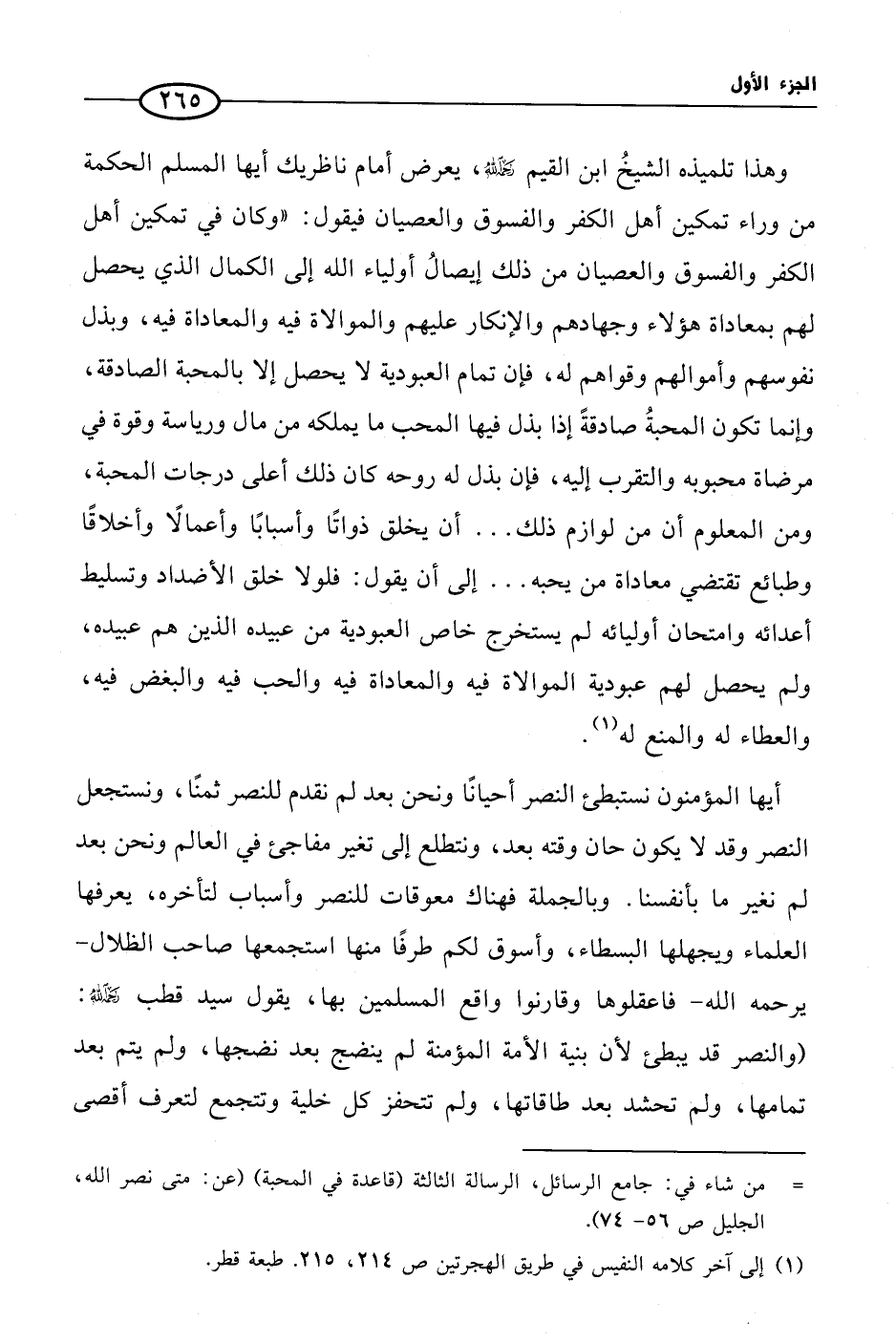 وهذا تلميذه الشيخُ ابن القيم رحمه الله، يعرض أمام ناظريك أيها المسلم الحكمة من وراء تمكين أهل الكفر والفسوق والعصيان فيقول: «وكان في تمكين أهل الكفر والفسوق والعصيان من ذلك إيصالُ أولياء الله إلى الكمال الذي يحصل لهم بمعاداة هؤلاء وجهادهم والإنكار عليهم والموالاة فيه والمعاداة فيه، وبذل نفوسهم وأموالهم وقواهم له، فإن تمام العبودية لا يحصل إلا بالمحبة الصادقة، وإنما تكون المحبةُ صادقةً إذا بذل فيها المحب ما يملكه من مال ورياسة وقوة في مرضاة محبوبه والتقرب إليه، فإن بذل له روحه كان ذلك أعلى درجات المحبة، ومن المعلوم أن من لوازم ذلك ... أن يخلق ذواتًا وأسبابًا وأعمالاً وأخلاقًا وطبائع تقتضي معاداة من يحبه ... إلى أن يقول: فلولا خلق الأضداد وتسليط أعدائه وامتحان أوليائه لم يستخرج خاص العبودية من عبيده الذين هم عبيده، ولم يحصل لهم عبودية الموالاة فيه والمعاداة فيه والحب فيه والبغض فيه، والعطاء له والمنع له (¬1).