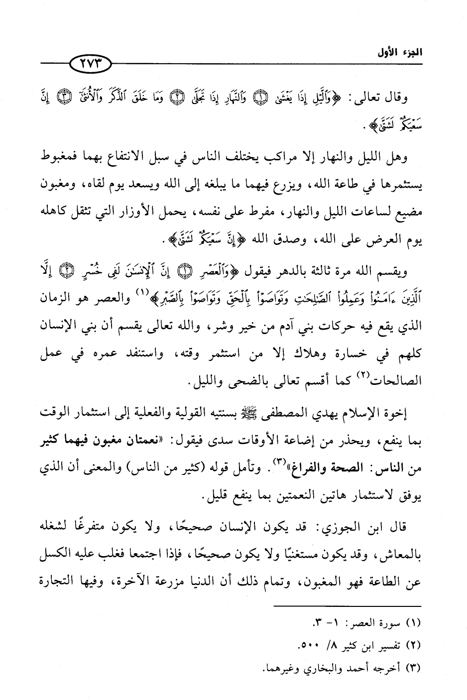 ويقسم الله مرة ثالثة بالدهر فيقول {والعصر، إن الإنسان لفي خسر، إلا الذين آمنوا وعملوا الصالحات وتواصوا بالحق وتواصوا بالصبر} (¬1) والعصر هو الزمان الذي يقع فيه حركات بني آدم من خير وشر، والله تعالى يقسم أن بني الإنسان كلهم في خسارة وهلاك إلا من استثمر وقته، واستنفد عمره في عمل الصالحات (¬2) كما أقسم تعالى بالضحى والليل.