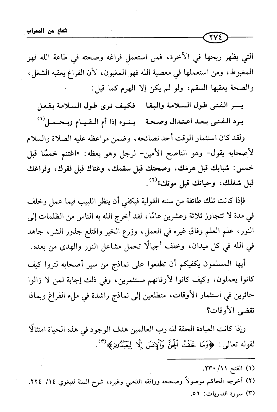 أيها المسلمون يكفيكم أن تطلعوا على نماذج من سير أصحابه لتروا كيف كانوا يعملون، وكيف كانوا لأوقاتهم مستثمرين، وفي ذلك إجابة لمن لا زالوا حائرين في استثمار الأوقات، متطلعين إلى نماذج راشدة في ملء الفراغ وبماذا تقضى الأوقات؟