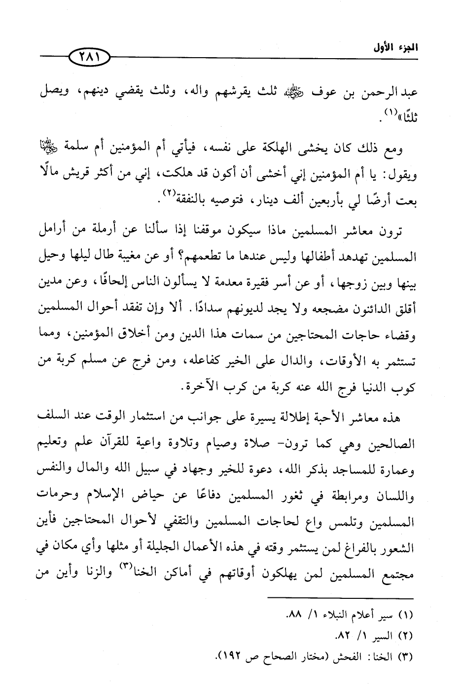 هذه معاشر الأحبة إطلالة يسيرة على جوانب من استثمار الوقت عند السلف الصالحين وهي كما ترون- صلاة وصيام وتلاوة واعية للقرآن علم وتعليم وعمارة للمساجد بذكر الله، دعوة للخير وجهاد في سبيل الله والمال والنفس واللسان ومرابطة في ثغور المسلمين دفاعًا عن حياض الإسلام وحرمات المسلمين وتلمس واع لحاجات المسلمين والتقفي لأحوال المحتاجين فأين الشعور بالفراغ لمن يستثمر وقته في هذه الأعمال الجليلة أو مثلها وأي مكان في مجتمع المسلمين لمن يهلكون أوقاتهم في أماكن الخنا (¬3) والزنا وأين من