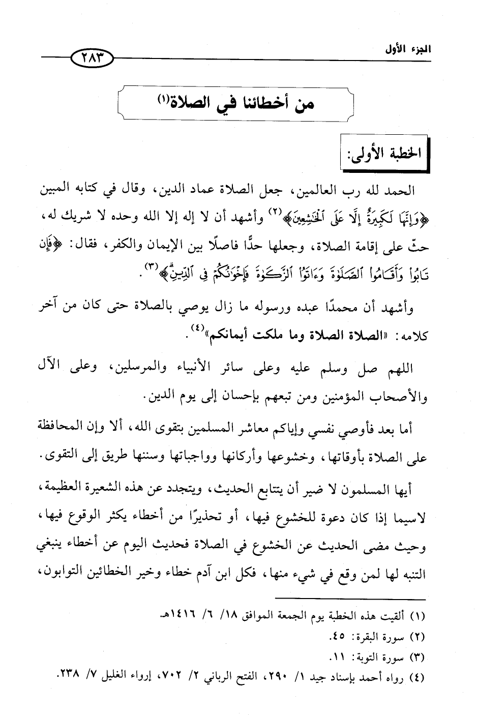 أيها المسلمون لا ضير أن يتتابع الحديث، ويتجدد عن هذه الشعيرة العظيمة، لاسيما إذا كان دعوة للخشوع فيها، أو تحذيرًا من أخطاء يكثر الوقوع فيها، وحيث مضى الحديث عن الخشوع في الصلاة فحديث اليوم عن أخطاء ينبغي التنبه لها لمن وقع في شيء منها، فكل ابن آدم خطاء وخير الخطائين التوابون،