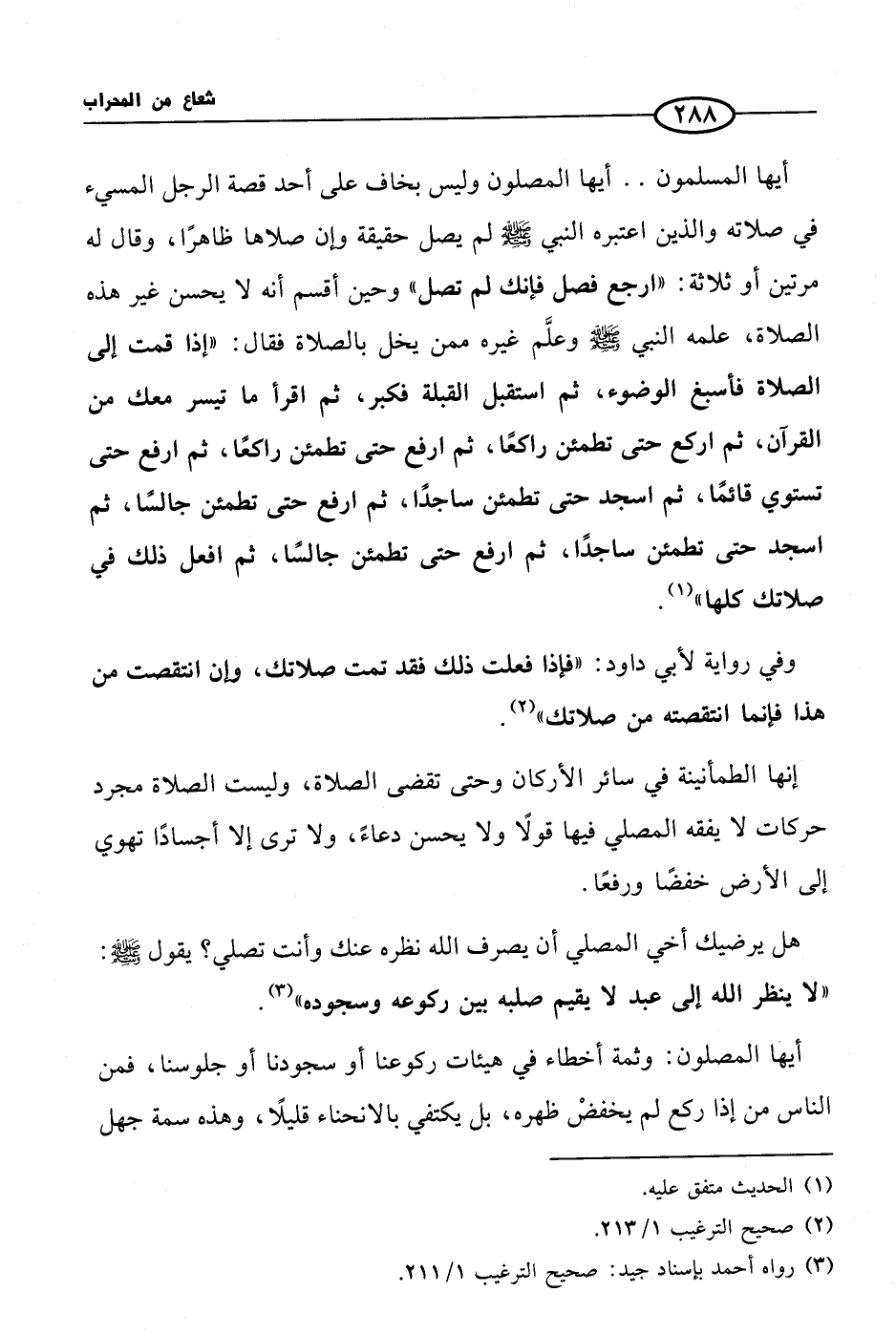 أيها المسلمون أيها المصلون وليس بخاف على أحد قصة الرجل المسيء في صلاته والذين اعتبره النبي صلى الله عليه وسلم لم يصل حقيقة وإن صلاها ظاهرًا، وقال له مرتين أو ثلاثة: «ارجع فصل فإنك لم تصل» وحين أقسم أنه لا يحسن غير هذه الصلاة، علمه النبي صلى الله عليه وسلم غيره ممن يخل بالصلاة فقال: «إذا قمت إلى الصلاة فأسبغ الوضوء، ثم استقبل القبلة فكبر، ثم اقرأ ما تيسر معك من القرآن، ثم اركع حتى تطمئن راكعًا، ثم ارفع حتى تطمئن راكعًا، ثم ارفع حتى تستوي قائمًا، ثم اسجد حتى تطمئن ساجدًا، ثم ارفع حتى تطمئن جالسًا، ثم اسجد حتى تطمئن ساجدًا، ثم ارفع حتى تطمئن جالسًا، ثم افعل ذلك في صلاتك كلها» (¬1).