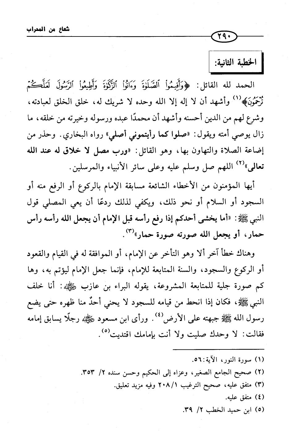 الحمد لله القائل: {وأقيموا الصلاة وآتوا الزكاة وأطيعوا الرسول لعلكم ترحمون} (¬1) وأشهد أن لا إله إلا الله وحده لا شريك له، خلق الخلق لعبادته، وشرع لهم من الدين أحسنه وأشهد أن محمدًا عبده ورسوله وخيرته من خلقه، ما زال يوصي أمته ويقول: «صلوا كما رأيتموني أصلي» رواه البخاري. وحذر من إضاعة الصلاة والتهاون بها، وهو القائل: «ورب مصل لا خلاق له عند الله تعالى» (¬2) اللهم صل وسلم عليه وعلى سائر الأنبياء والمرسلين.