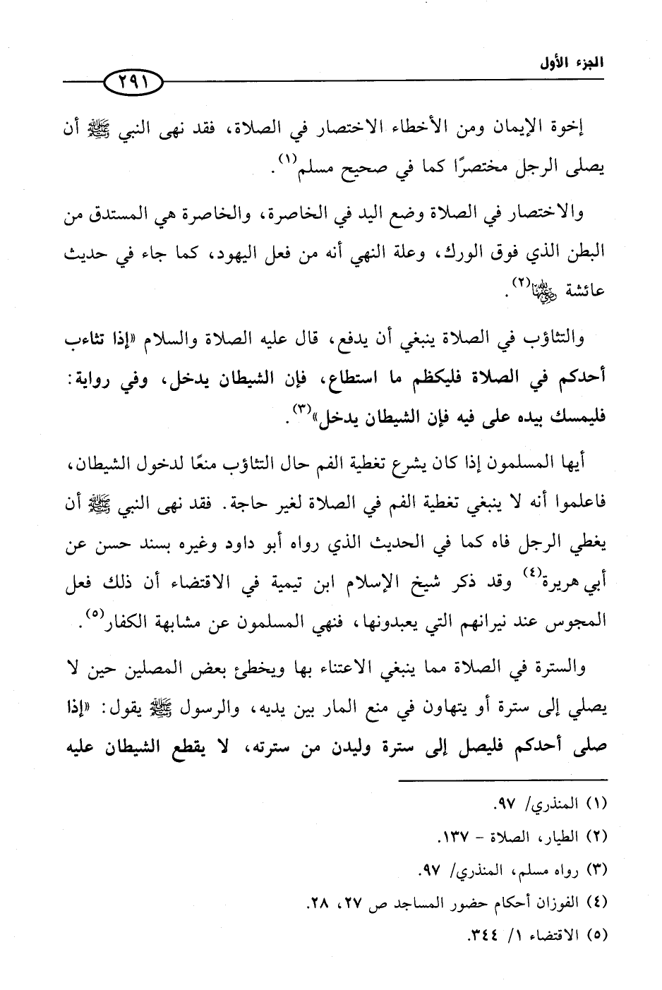أيها المسلمون إذا كان يشرع تغطية الفم حال التثاؤب منعًا لدخول الشيطان، فاعلموا أنه لا ينبغي تغطية الفم في الصلاة لغير حاجة. فقد نهى النبي صلى الله عليه وسلم أن يغطي الرجل فاه كما في الحديث الذي رواه أبو داود وغيره بسند حسن عن أبي هريرة (¬4) وقد ذكر شيخ الإسلام ابن تيمية في الاقتضاء أن ذلك فعل المجوس عند نيرانهم التي يعبدونها، فنهي المسلمون عن مشابهة الكفار (¬5).