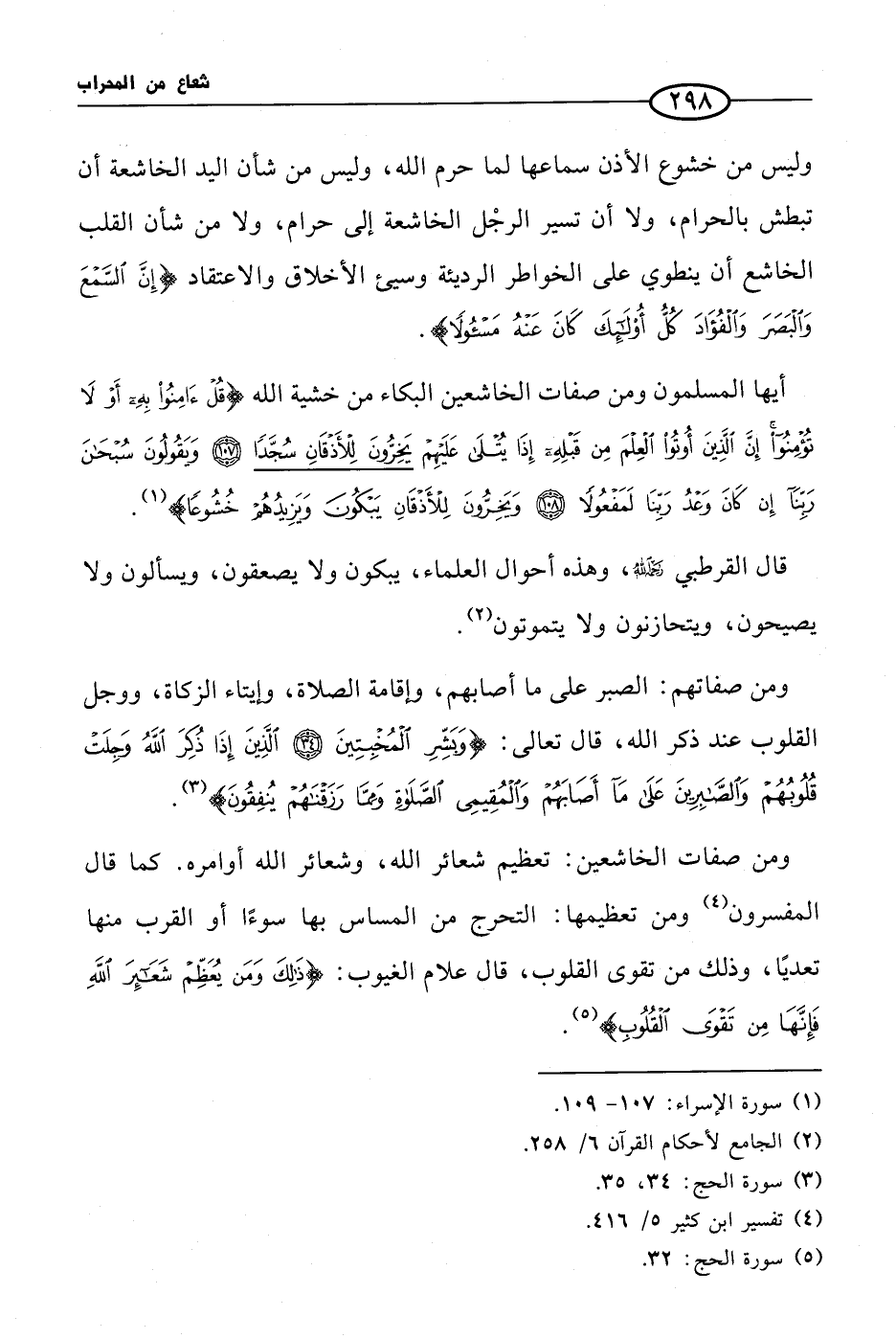 ومن صفات الخاشعين: تعظيم شعائر الله، وشعائر الله أوامره. كما قال المفسرون (¬4) ومن تعظيمها: التحرج من المساس بها سوءًا أو القرب منها تعديًا، وذلك من تقوى القلوب، قال علام الغيوب: {ذلك ومن يعظم شعائر الله فإنها من تقوى القلوب} (¬5).
