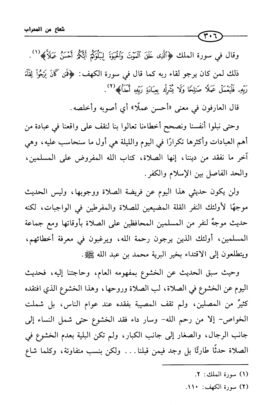 ولن يكون حديثي هذا اليوم عن فريضة الصلاة ووجوبها، وليس الحديث موجهًا لأولئك النفر القلة المضيعين للصلاة والمفرطين في الواجبات، لكنه حديث موجهٌ لنفر من المسلمين المحافظين على الصلاة بأوقاتها ومع جماعة المسلمين، أولئك الذين يرجون رحمة الله، ويرغبون في معرفة أخطائهم، ويتطلعون إلى الاقتداء بخير البرية محمد بن عبد الله صلى الله عليه وسلم.