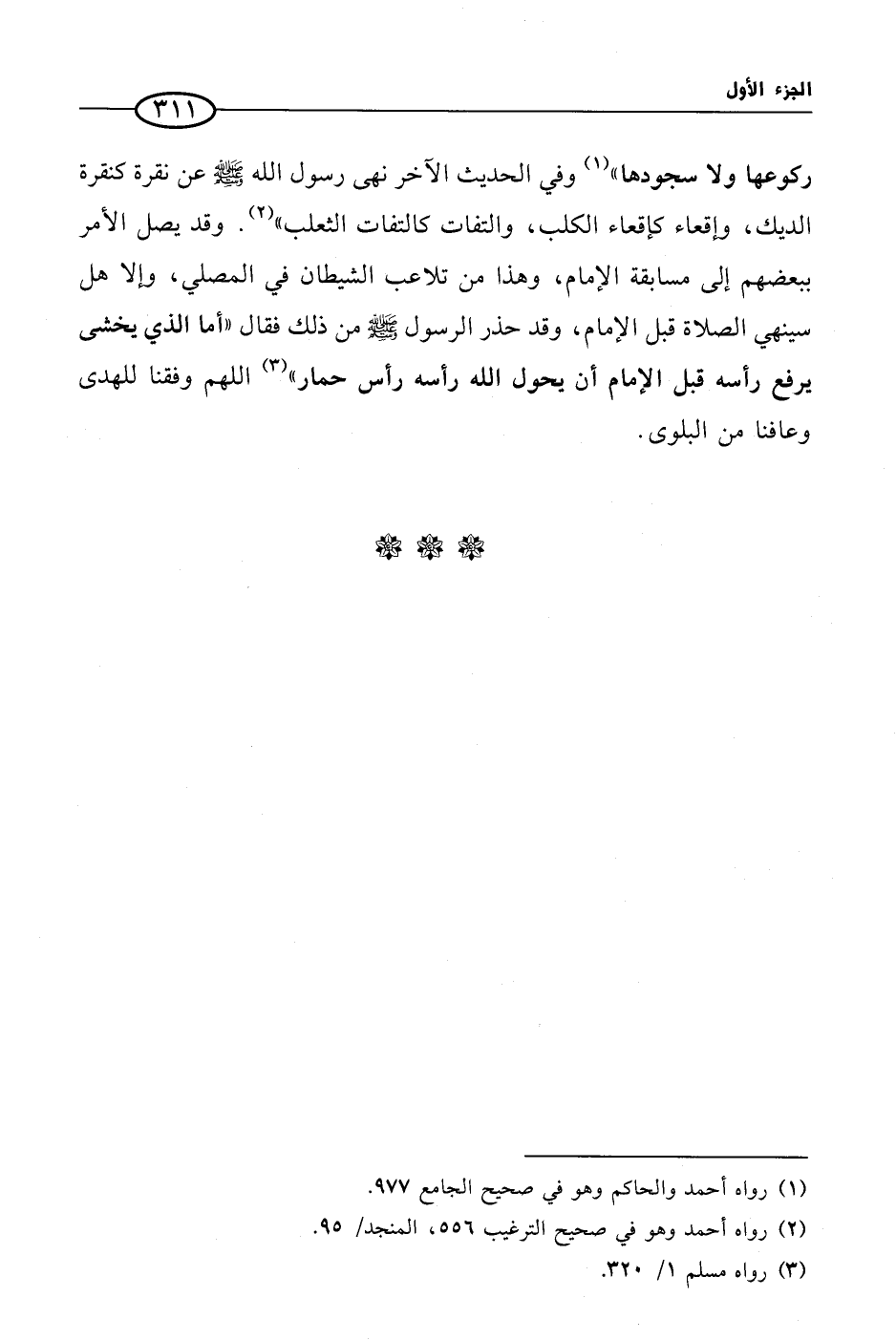 ركوعها ولا سجودها» (¬1) وفي الحديث الآخر نهى رسول الله صلى الله عليه وسلم عن نقرة كنقرة الديك، وإقعاء كإقعاء الكلب، والتفات كالتفات الثعلب» (¬2). وقد يصل الأمر ببعضهم إلى مسابقة الإمام، وهذا من تلاعب الشيطان في المصلي، وإلا هل سينهي الصلاة قبل الإمام، وقد حذر الرسول صلى الله عليه وسلم من ذلك فقال «أما الذي يخشى يرفع رأسه قبل الإمام أن يحول الله رأسه رأس حمار» (¬3) اللهم وفقنا للهدى وعافنا من البلوى.