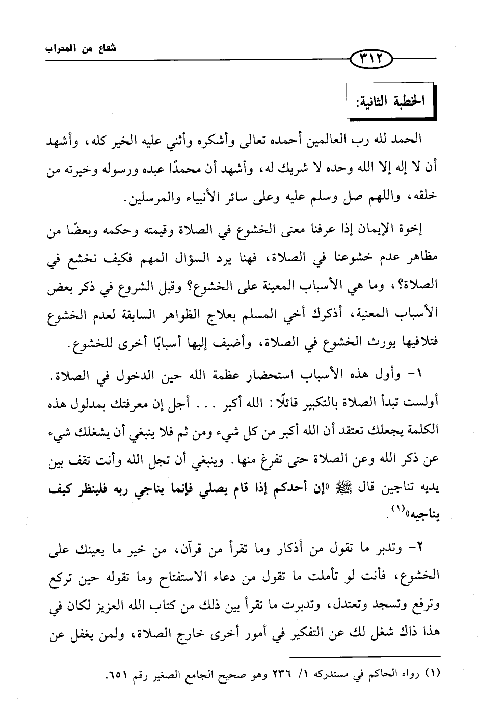 1 - وأول هذه الأسباب استحضار عظمة الله حين الدخول في الصلاة. أولست تبدأ الصلاة بالتكبير قائلاً: الله أكبر ... أجل إن معرفتك بمدلول هذه الكلمة يجعلك تعتقد أن الله أكبر من كل شيء ومن ثم فلا ينبغي أن يشغلك شيء عن ذكر الله وعن الصلاة حتى تفرغ منها. وينبغي أن تجل الله وأنت تقف بين يديه تناجين قال صلى الله عليه وسلم «إن أحدكم إذا قام يصلي فإنما يناجي ربه فلينظر كيف يناجيه» (¬1).