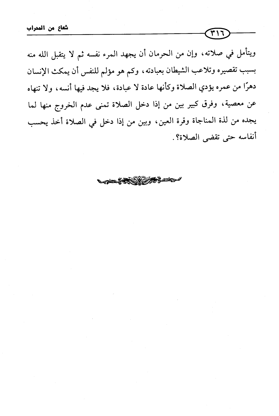 ويتأمل في صلاته، وإن من الحرمان أن يجهد المرء نفسه ثم لا يتقبل الله منه بسبب تقصيره وتلاعب الشيطان بعبادته، وكم هو مؤلم للنفس أن يمكث الإنسان دهرًا من عمره يؤدي الصلاة وكأنها عادة لا عبادة، فلا يجد فيها أنسه، ولا تنهاه عن معصية، وفرق كبير بين من إذا دخل الصلاة تمنى عدم الخروج منها لما يجده من لذة المناجاة وقرة العين، وبين من إذا دخل في الصلاة أخذ يحسب أنفاسه حتى تقضى الصلاة؟ .