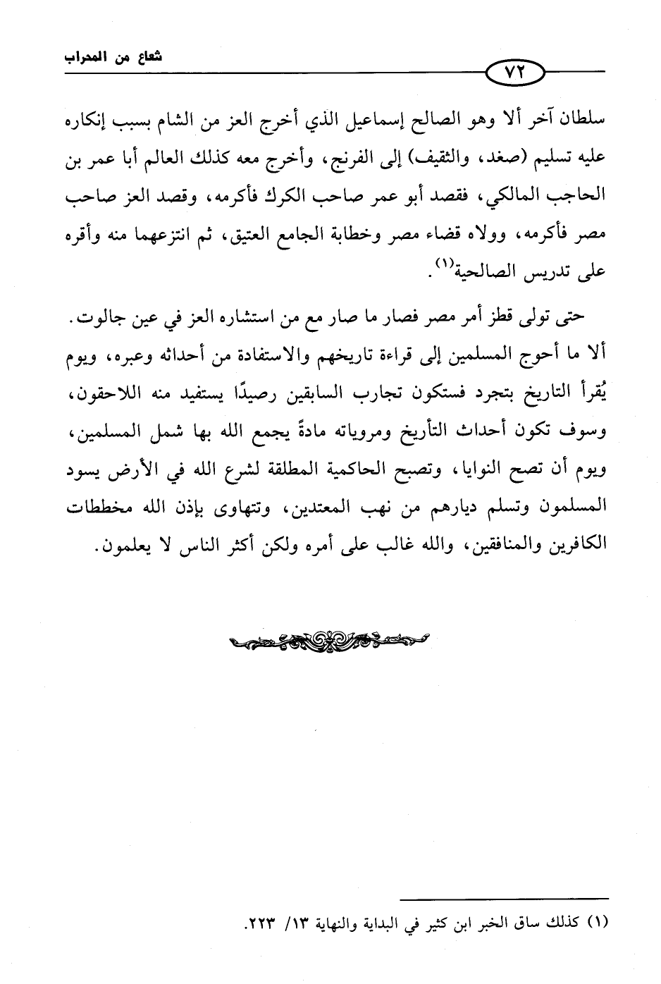 حتى تولى قطز أمر مصر فصار ما صار مع من استشاره العز في عين جالوت. ألا ما أحوج المسلمين إلى قراءة تاريخهم والاستفادة من أحداثه وعبره، ويوم يُقرأ التاريخ بتجرد فستكون تجارب السابقين رصيدًا يستفيد منه اللاحقون، وسوف تكون أحداث التأريخ ومروياته مادةً يجمع الله بها شمل المسلمين، ويوم أن تصح النوايا، وتصبح الحاكمية المطلقة لشرع الله في الأرض يسود المسلمون وتسلم ديارهم من نهب المعتدين، وتتهاوى بإذن الله مخططات الكافرين والمنافقين، والله غالب على أمره ولكن أكثر الناس لا يعلمون.