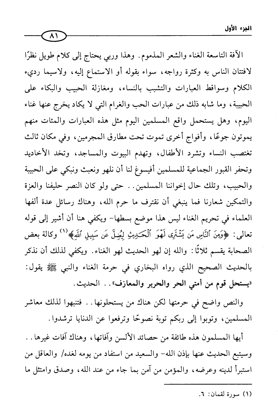 الآفة التاسعة الغناء والشعر المذموم. وهذا وربي يحتاج إلى كلام طويل نظرًا لافتتان الناس به وكثرة رواجه، سواء بقوله أو الاستماع إليه، ولاسيما رديء الكلام وسواقط العبارات والتشبب بالنساء، ومغازلة الحبيب والبكاء على الحبيبة، وما شابه ذلك من عبارات الحب والغرام التي لا يكاد يخرج عنها غناء اليوم، وهل يستحمل واقع المسلمين اليوم مثل هذه العبارات والمئات منهم يموتون جوعًا، وأفواج أخرى تموت تحت مطارق المجرمين، وفي مكان ثالث تغتصب النساء وتشرد الأطفال، وتهدم البيوت والمساجد، وتخد الأخاديد وتحفر القبور الجماعية للمسلمين أفيسوغ لنا أن نلهو ونعبث ونبكي على الحبيبة والحبيب، وتلك حال إخواننا المسلمين .. حتى ولو كان النصر حليفنا والعزة والتمكين شعارنا فما ينبغي أن نقترف ما حرم الله، وهناك رسائل عدة ألفها العلماء في تحريم الغناء ليس هذا موضع بسطها- ويكفي هنا أن أشير إلى قوله تعالى: {ومن الناس من يتخذ لهو الحديث ليضل عن سبيل الله} (¬1) وكالة بعض الصحابة يقسم ثلاثًا: والله إن لهو الحديث لهو الغناء. ويكفي لذلك أن نذكر بالحديث الصحيح الذي رواه البخاري في حرمة الغناء والنبي صلى الله عليه وسلم يقول: «يستحل قوم من أمتي الحر والحرير والمعازف» .. الحديث.