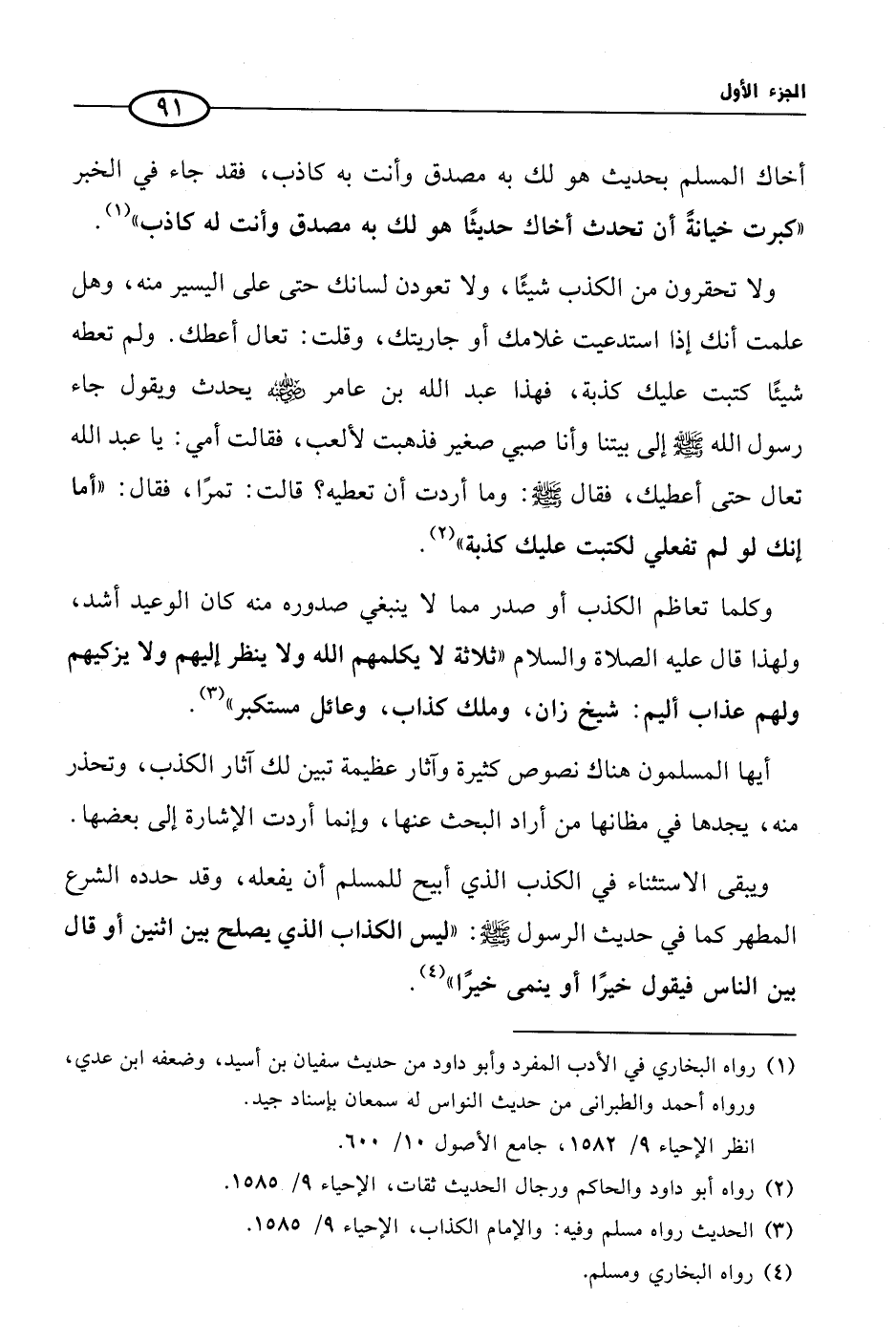 ولا تحقرون من الكذب شيئًا، ولا تعودن لسانك حتى على اليسير منه، وهل علمت أنك إذا استدعيت غلامك أو جاريتك، وقلت: تعال أعطك. ولم تعطه شيئًا كتبت عليك كذبة، فهذا عبد الله بن عامر رضي الله عنه يحدث ويقول جاء رسول الله صلى الله عليه وسلم إلى بيتنا وأنا صبي صغير فذهبت لألعب، فقالت أمي: يا عبد الله تعال حتى أعطيك، فقال صلى الله عليه وسلم: وما أردت أن تعطيه؟ قالت: تمرًا، فقال: «أما إنك لو لم تفعلي لكتبت عليك كذبة» (¬2).