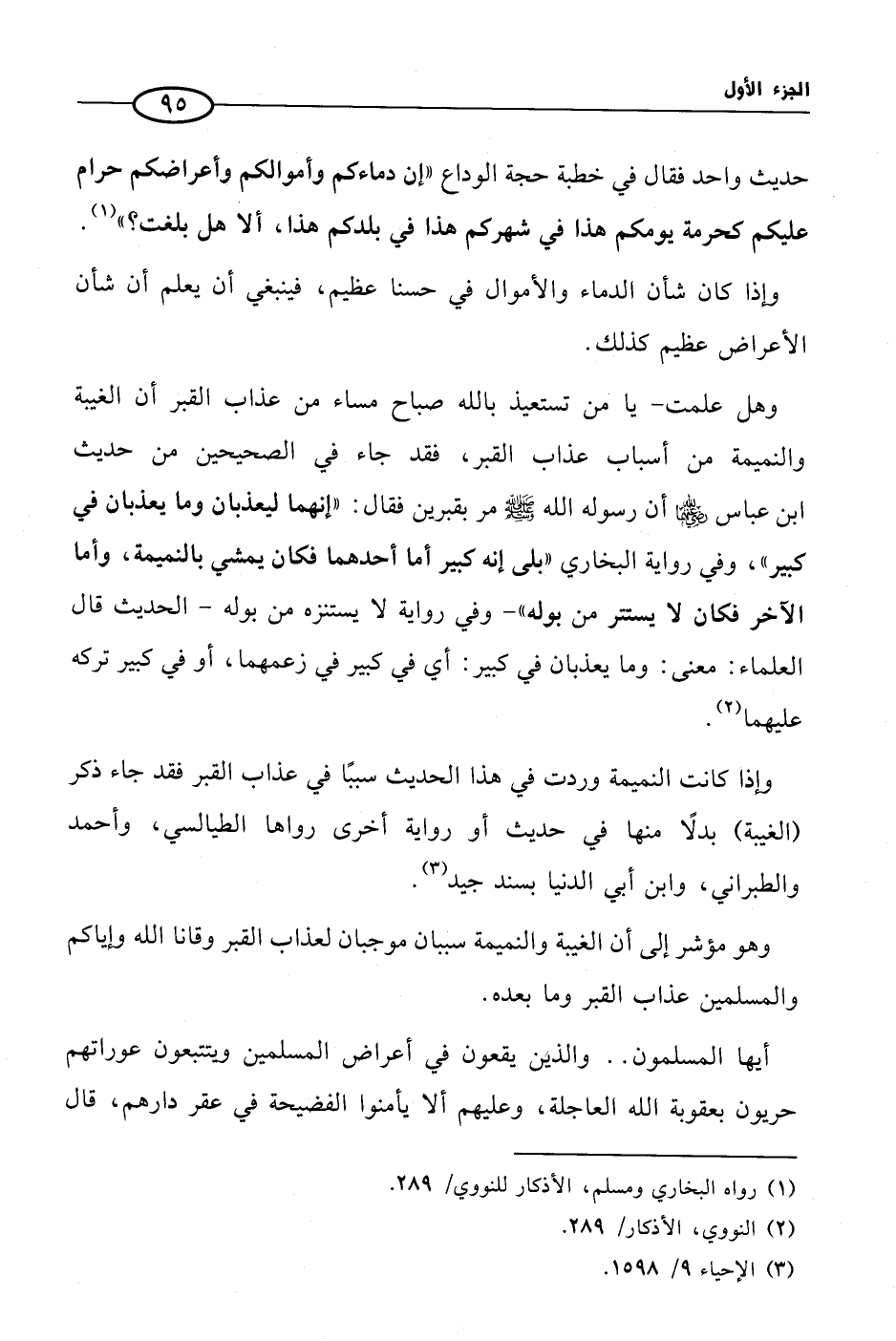وهل علمت- يا من تستعيذ بالله صباح مساء من عذاب القبر أن الغيبة والنميمة من أسباب عذاب القبر، فقد جاء في الصحيحين من حديث ابن عباس-رضي الله عنهما- أن رسوله الله صلى الله عليه وسلم مر بقبرين فقال: «إنهما ليعذبان وما يعذبان في كبير»، وفي رواية البخاري «بلى إنه كبير أما أحدهما فكان يمشي بالنميمة، وأما الآخر فكان لا يستتر من بوله» - وفي رواية لا يستنزه من بوله - الحديث قال العلماء: معنى: وما يعذبان في كبير: أي في كبير في زعمهما، أو في كبير تركه عليهما (¬2).