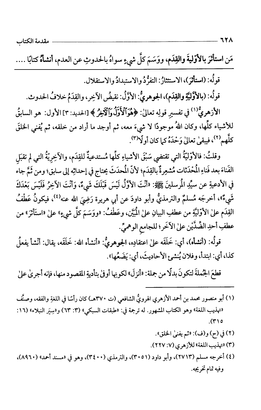 الأزهري في تفسير قوله تعالى: (هُوَ الأَوَّلُ وَالآخِرُ) [الحديد: 3] الأول: هو السابق للأشياء كلها، وكان الله موجوداً لا شيء معه، ثم أوجد ما أراد من خلقه، ثم يفني الخلق كلهم، فيبقى تعالى وحده كما كان أولاً.