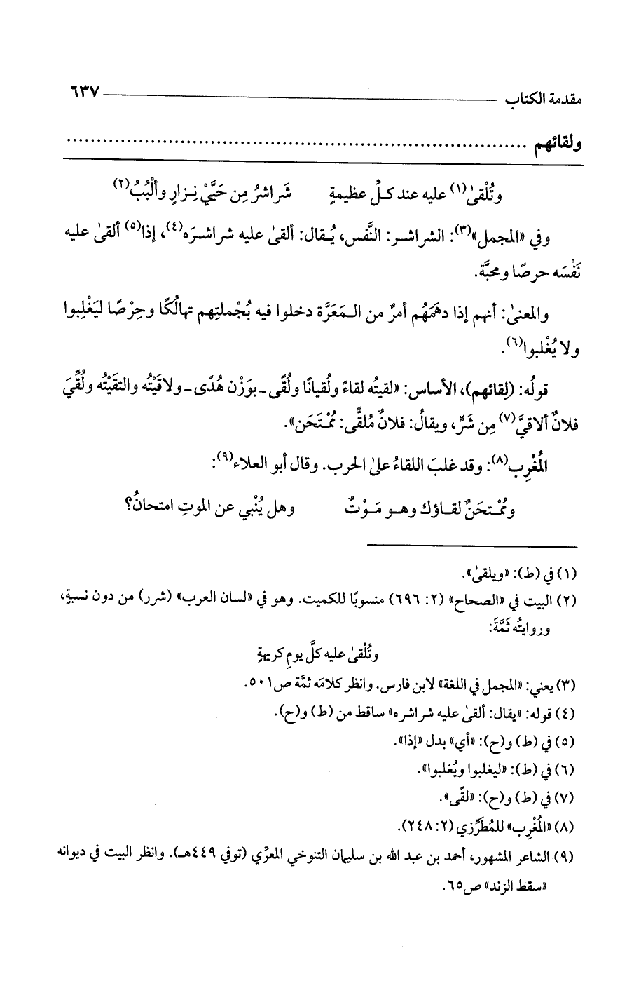 المغرب: وقد غلب اللقاء على الحرب. وقال أبو العلاء: