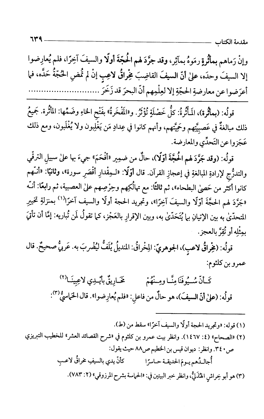 وإن رماهم بمأثرة رموه بمآثر، وقد جرد لهم الحجة أولاً والسيف آخراً، فلم يعارضوا إلا السيف وحده، على أن السيف القاضب مخراق لاعب إن لم تمض الحجة حده، فما أعرضوا عن معارضة الحجة إلا لعلمهم أن البحر قد زخر .......
