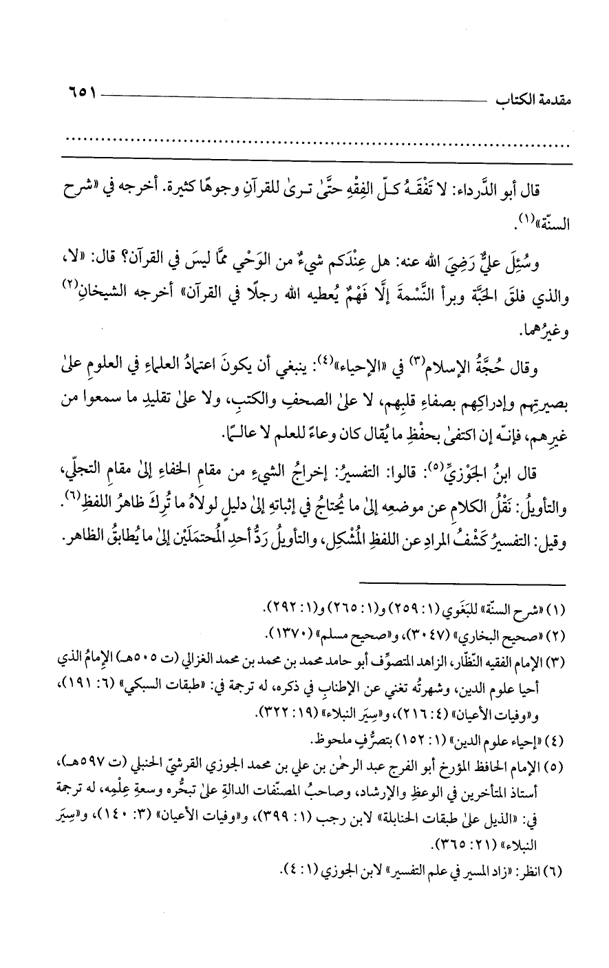 وقال حجة الإسلام في "الإحياء": ينبغي أن يكون اعتماد العلماء في العلوم على بصيرتهم وإدراكهم بصفاء قلبهم، لا على الصحف والكتب، ولا على تقليد ما سمعوا من غيرهم، فإنه إن اكتفى بحفظ ما يقال كان وعاء للعلم لا عالماً.