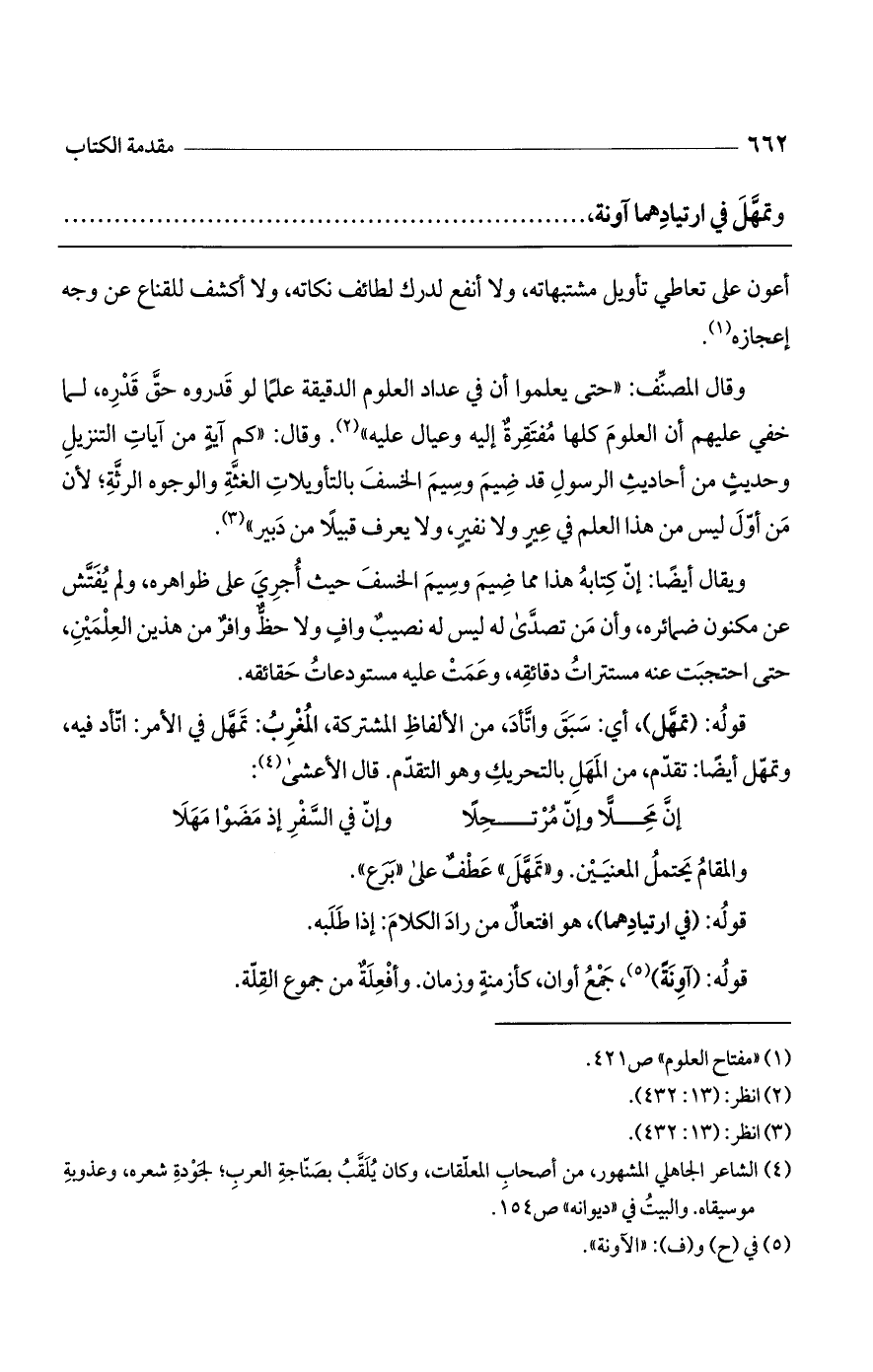 وقال المصنف: "حتى يعلموا أن في عداد العلوم الدقيقة علماً لو قدروه حق قدره، لما خفي عليهم أن العلوم كلها مفتقرة إليه وعيال عليه". وقال: "كم آية من آيات التنزيل وحديث من أحاديث الرسول قد ضيم وسيم الخسف بالتأويلات الغثة والوجوه الرثة؛ لأن من أول ليس من هذا العلم في عير ولا نفير، ولا يعرف قبيلاً من دبير".