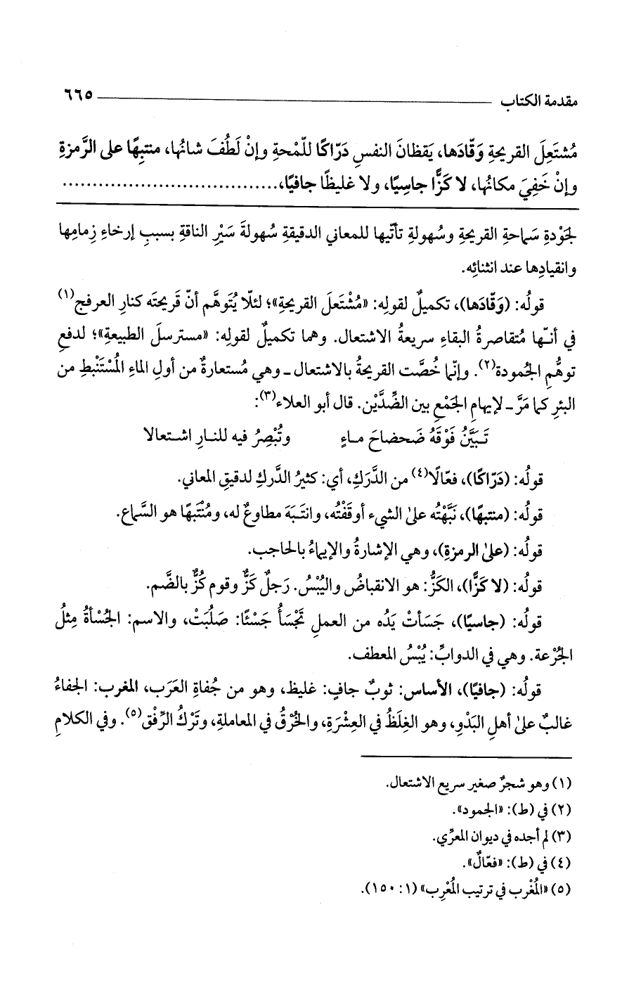 قوله: (وقادها)، تكميل لقوله: "مشتعل القريحة"؛ لئلا يتوهم أن قريحته كنار العرفج في أنها متقاصرة البقاء سريعة الاشتقال. وهما تكميل لقوله: "مسترسل الطبيعة"؛ لدفع توهم الجمودة. وإنما خصت القريحة بالاشتعال- وهي مستعارة من أول الماء المستنبط من البئر مكا مر- لإيهام الجمع بين الضدين. قال أبو العلاء: