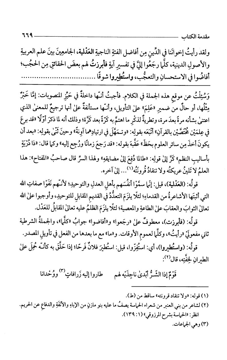 ولقد رأيت إخواننا في الدين من أفاضل الفئة الناجية العدلية، الجامعين بين علم العربية والأصول الدينية، كلما رجعوا إلي في تفسير آية فأبرزت لهم بعض الحقائق من الحجب؛ أفاضوا في الاستحسان والتعجب، واستطيروا شوقاً