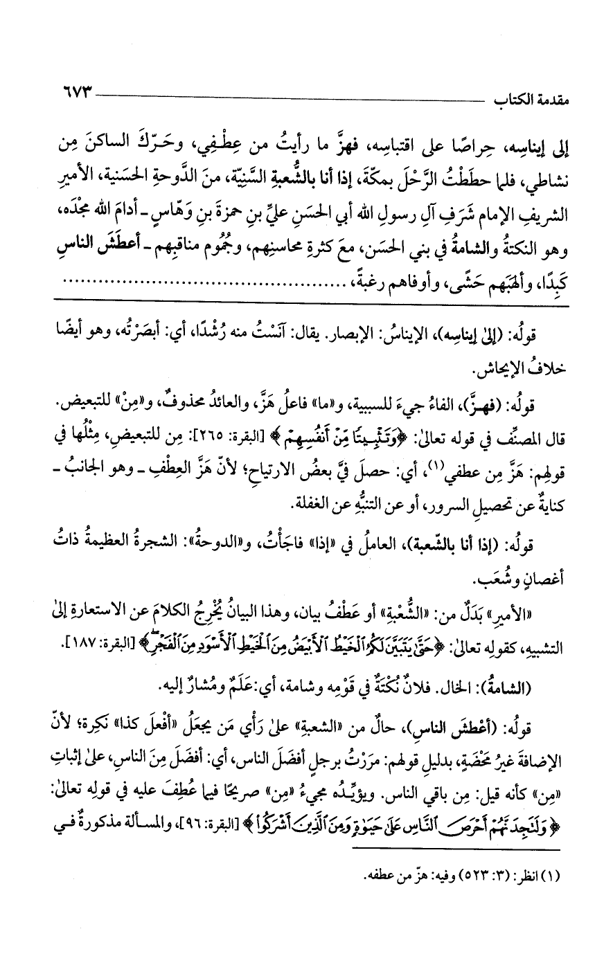 إلى إيناسه، حراصاً على اقتباسه، فهز ما رأيت من عطفي، وحرك الساكن من نشاطي، فلما حططت الرحل بمكة، إذا أنا بالشعبة السنية، من الدوحة الحسنية، الأمير الشريف الإمام شرف آل رسول الله أبي الحسن علي بن حمزة بن وهاس- أدام الله مجده، وهو النكتة والشامة في بني الحسن، مع كثرة محاسنهم، وجموم مناقبهم- أعطش الناس كبداً، وألهبهم حشى، وأوفاهم رغبة،