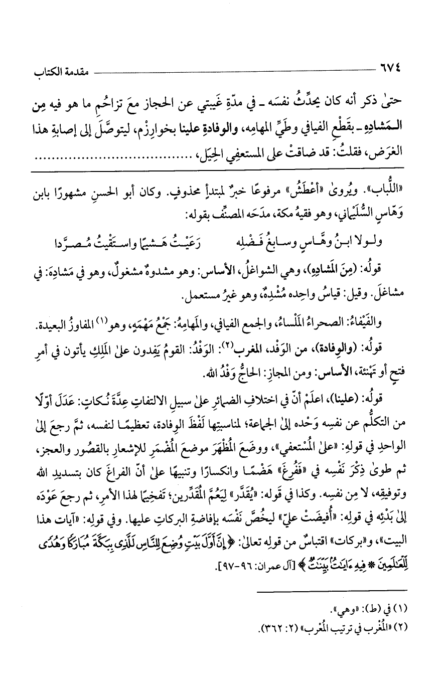 قوله: (علينا)، اعلم أن في اختلاف الضمائر على سبيل الالتفات عدة نكات: عدل أولاً من التكلم عن نفسه وحده إلى الجماعة؛ لمناسبتها لفظ الوفادة، تعظيماً لنفسه، ثم رجع إلى الواحد في قوله: "على المستعفي"، ووضع المظهر موضع المضمر للإشعار بالقصور والعجز، ثم طوى ذكر نفسه في "ففرغ" هضماً وانكساراً وتنبيهاً على أن الفراغ كان بتسديد الله وتوفيقه، لا من نفسه. وكذا في قوله: "يقدر" ليعم المقدرين؛ تفخيماً لهذا الأمر، ثم رجع عوده إلى بدئه في قوله: "أفيضت علي" ليخص نفسه بإفاضة البركات عليها. وفي قوله: "آيات هذا البيت"، و"بركات" اقتباس من قوله تعالى: (إِنَّ أَوَّلَ بَيْتٍ وُضِعَ لِلنَّاسِ لَلَّذِي بِبَكَّةَ مُبَارَكاً وَهُدًى لِلْعَالَمِينَ* فِيهِ آيَاتٌ بَيِّنَاتٌ) [آل عمران: 96 - 97].