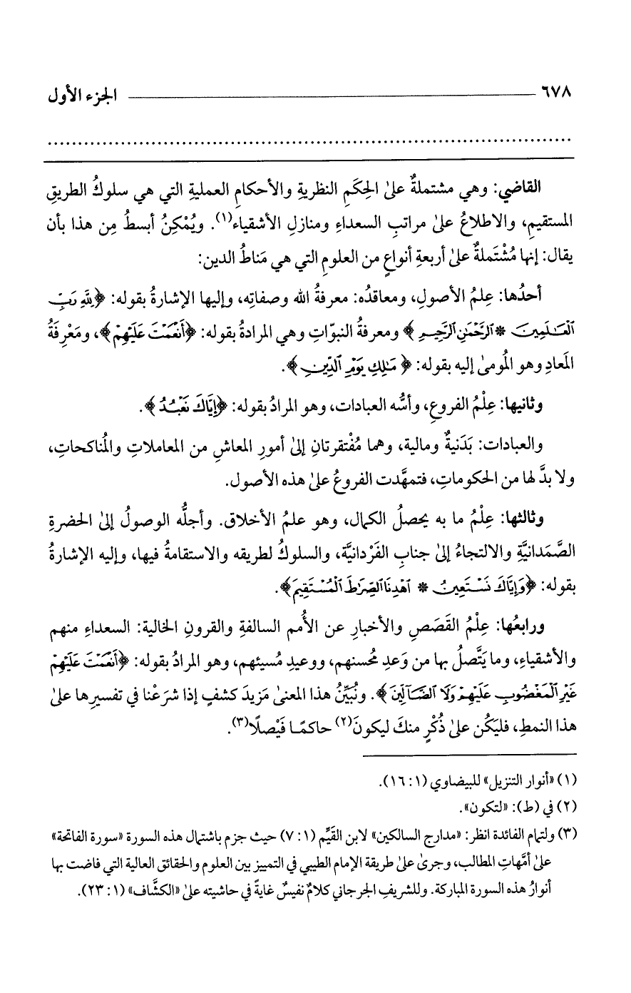 أحدها: علم الأصول، ومعاقده: معرفة الله وصفاته، وإليها الإشارة بقوله: (لِلَّهِ رَبِّ الْعَالَمِينَ* الرَّحْمَنِ الرَّحِيمِ) ومعرفة النبوات وهي المرادة بقوله: (أَنْعَمْتَ عَلَيْهِمْ)، ومعرفة المعاد وهو المومى إليه بقوله: (مَالِكِ يَوْمِ الدِّينِ).