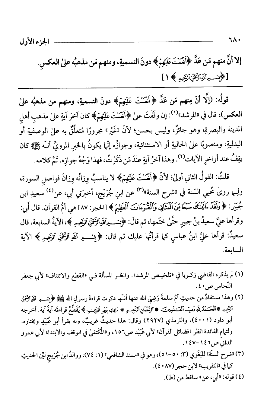قوله: (إلا أن منهم من عد (أَنْعَمْتَ عَلَيْهِمْ) دون التسمية، ومنهم من مذهبه على العكس)، قال في "المرشد": إن وقفت على (أَنْعَمْتَ عَلَيْهِمْ) كان آخر آية على مذهب أهل المدينة والبصرة، وهو جائز، وليس بحسن؛ لأن "غير" مجروراً متعلق به على الوصفية أو البدلية، ومنصوباً على الحالية أو الاستثنائية، وجوازه إنما يكون بالخبر المروي أنه صلى الله عليه وسلم كان يقف عند أواخر الآيات. وهذا آخر آية عند من ذكرت، فهذا وجه جوازه. تم كلامه.