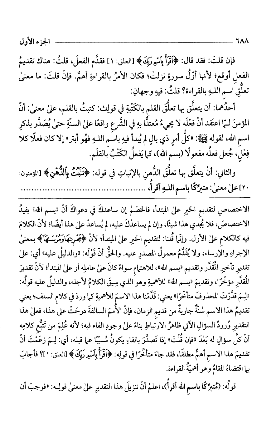 فإن قلت: فقد قال: (اقْرَا بِاسْمِ رَبِّكَ) [العلق: 1] فقدم الفعل، قلت: هناك تقديم الفعل أوقع؛ لأنها أول سورة نزلت؛ فكان الأمر بالقراءة أهم. فإن قلت: ما معنى تعلق اسم الله بالقراءة؟ قلت: فيه وجهان: