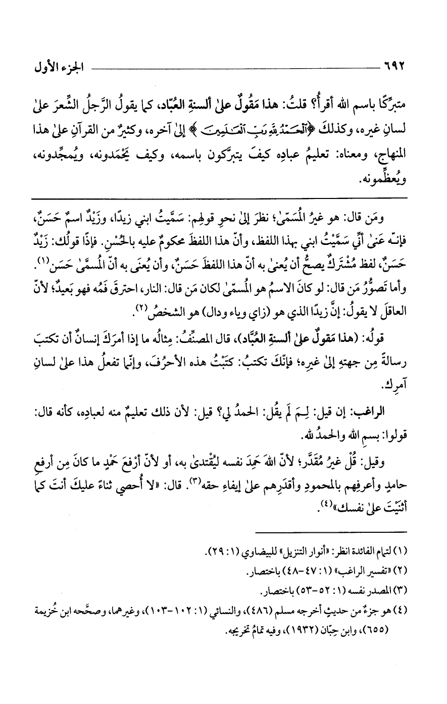 ومن قال: هو غير المسمى؛ نظر إلى نحو قولهم: سميت ابني زيداً، وزيد اسم حسن، فإنه عنى أني سميت ابني بهذا اللفظ، وأن هذا اللفظ محكوم عليه بالحسن. فإذا قولك: زيد حسن، لفظ مشترك يصح أن يعنى به أن هذا اللفظ حسن، وأن يعنى به أن المسمى حسن. وأما تصور من قال: لو كان الاسم هو المسمى لكان من قال: النار، احترق فمه فهو بعيد؛ لأن العاقل لا يقول: إن زيداً الذي هو (زاي وياء ودال) هو الشخص.