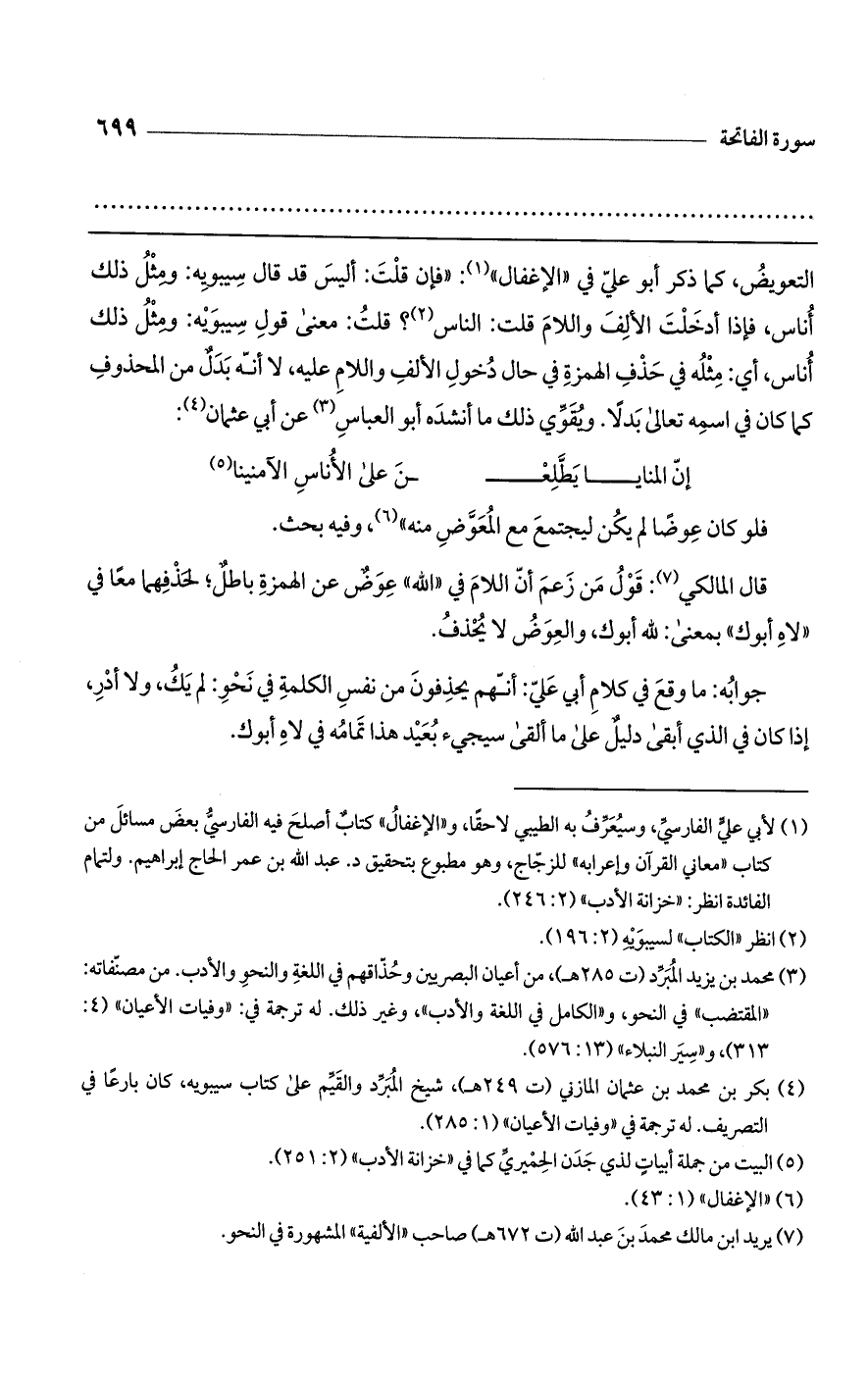 التعويض، كما ذكر أبو علي في "الإغفال": "فإن قلت: أليس قد قال سيبويه: ومثل ذلك أناس، فإذا أدخلت الألف واللام قلت: الناس؟ قلت: معنى قول سيبويه: ومثل ذلك أناس، أي: مثله في حذف الهمزة في حال دخول الألف واللام عليه، لا أنه بدل من المحذوف كما كان في اسمه تعالى بدلاً. ويقوي ذلك ما أنشده أبو العباس عن أبي عثمان: