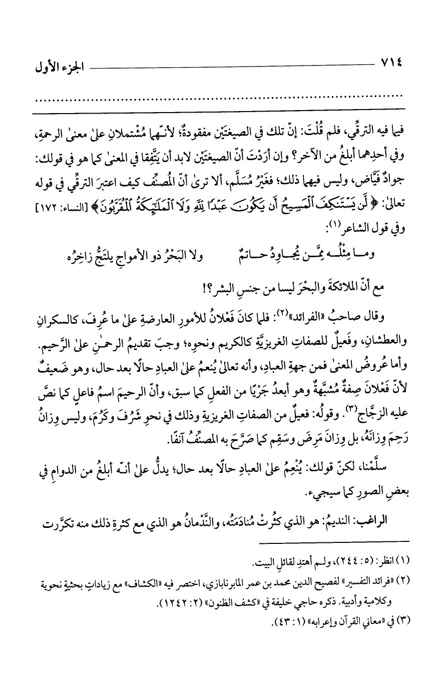 وقال صاحب "الفرائد": فلما كان فعلان للأمور العارضة على ما عرف، كالسكران والعطشان، وفعيل للصفات الغريزية كالكريم ونحوه؛ وجب تقديم الرحمن على الرحيم. وأما عروض المعنى فمن جهة العباد، وأنه تعالى ينعم على العباد حالاً بعد حال، وهو ضعيف لأن فعلان صفة مشبهة وهو أبعد جرياً من الفعل كما سبق، وأن الرحيم اسم فاعل كما نص عليه الزجاج. وقوله: فعيل من الصفات الغريزية وذلك في نحو شرف وكرم، وليس وزان رحم وزانه، بل وزان مرض وسقم كما صرح به المصنف آنفاً.