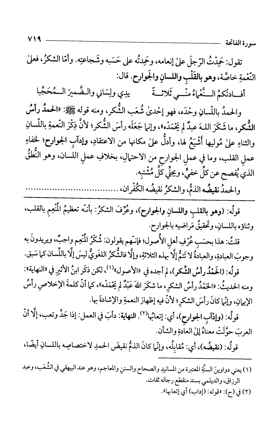 قلت: هذا بحسب عرف أهل الأصول؛ فإنهم يقولون: شكر المنعم واجب، ويريدون به وجوب العبادة، والعبادة لا تتم إلا بهذه الثلاثة، وإلا فالشكر اللغوي ليس إلا باللسان كما سبق.