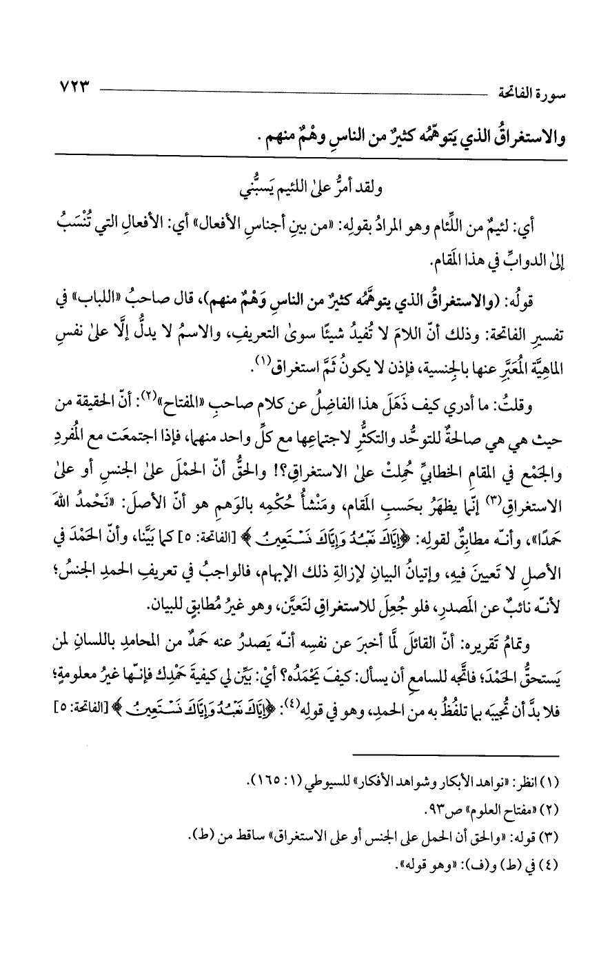 قوله: (والاستغراق الذي يتوهمه كثير من الناس وهم منهم)، قال صاحب "اللباب" في تفسير الفاتحة: وذلك أن اللام لا تفيد شيئاً سوى التعريف، والاسم لا يدل إلا على نفس الماهية المعبر عنها بالجنسية، فإذن لا يكون ثم استغراق.