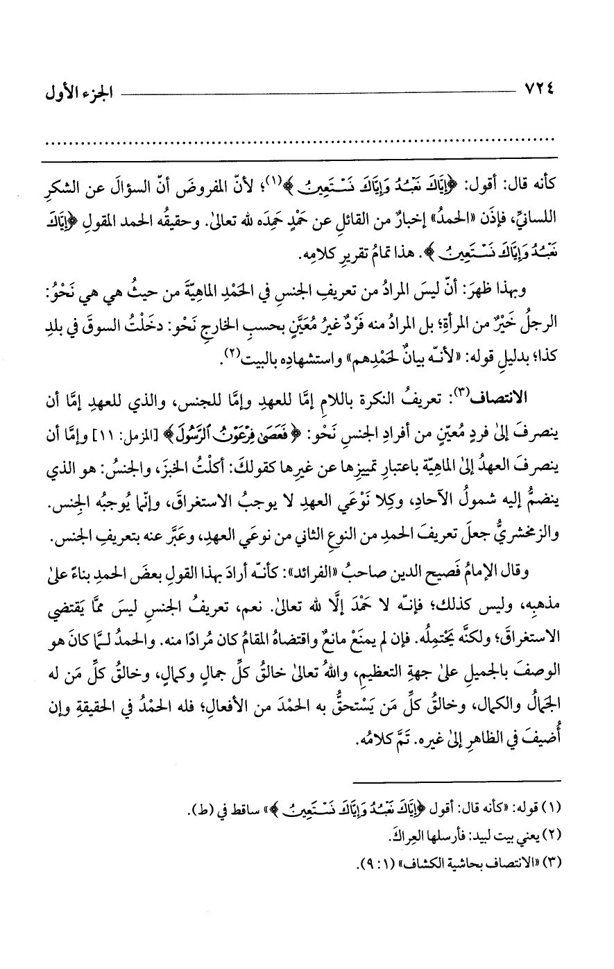 وقال الإمام فصيح الدين صاحب "الفرائد": كأنه أراد بهذا القول بعض الحمد بناءً على مذهبه، وليس كذلك؛ فإنه لا حمد إلا لله تعالى. نعم، تعريف الجنس ليس مما يقتضي الاستغراق؛ ولكنه يحتمله. فإن لم يمنع مانع واقتضاه المقام كان مراداً منه. والحمد لما كان هو الوصف بالجميل على جهة التعظيم، والله تعالى خالق كل جمال وكمال، وخالق كل من له الجمال والكمال، وخالق كل من يستحق به الحمد من الأفعال؛ فله الحمد في الحقيقة وإن أضيف في الظاهر إلى غيره. تم كلامه.