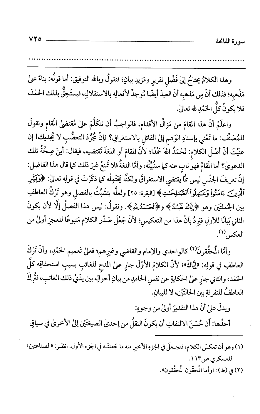 وأما المحققون كالواحدي والإمام والقاضي وغيرهم؛ فعلى تعميم الحمد، وأن ترك العاطف في قوله: "إياك"؛ لأن الكلام الأول جار على المدح للغائب بسبب استحقاقه كل الحمد، والثاني جار على الحكاية عن نفس الحامد من بيان أحواله بين يدي ذلك الغائب، فترك العاطف للتفرقة بين الحالتين، لا للبيان.