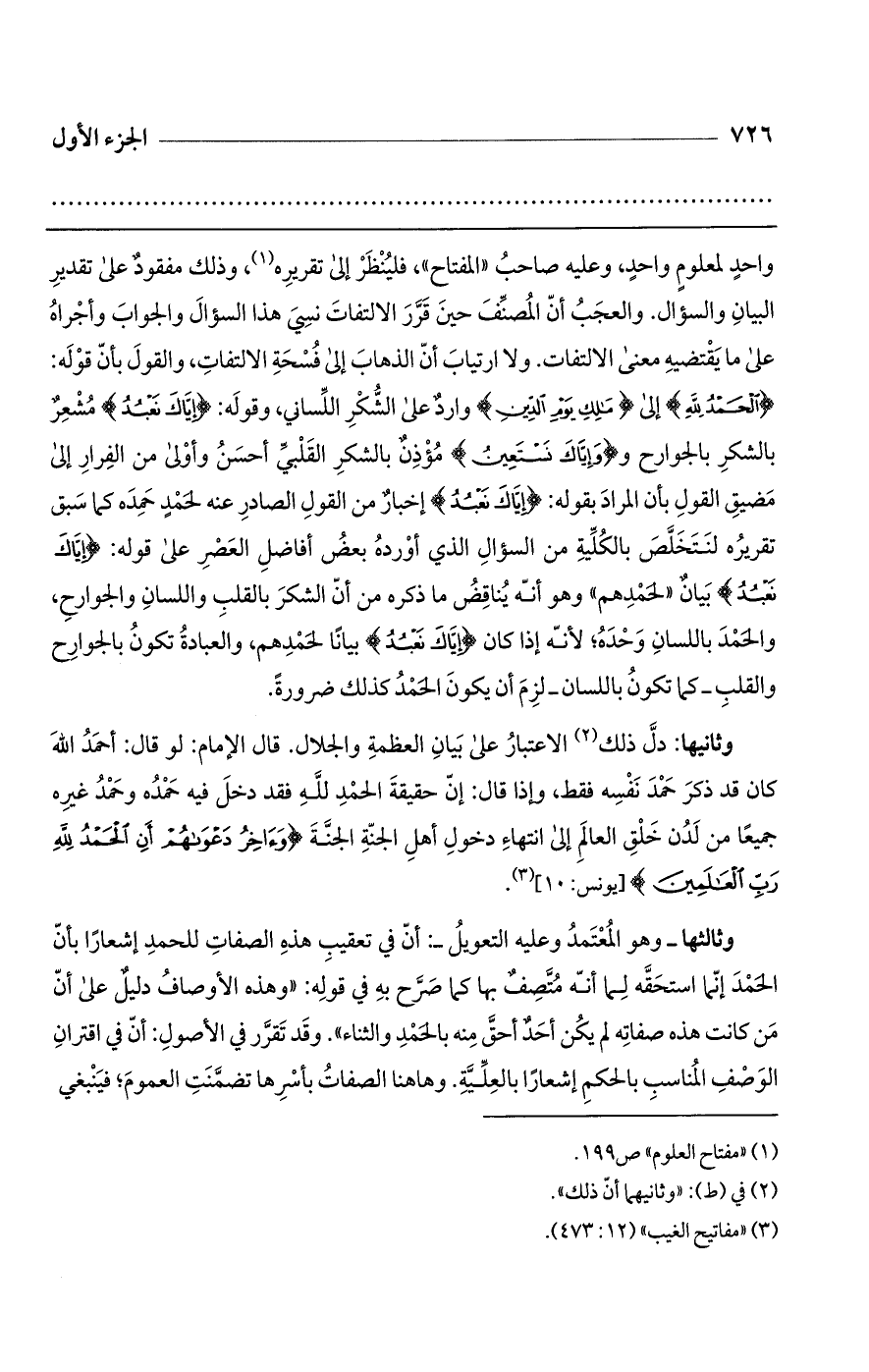 وثانيها: دل ذلك الاعتبار على بيان العظمة والجلال. قال الإمام: لو قال: أحمد الله كان قد ذكر حمد نفسه فقط، وإذا قال: إن حقيقة الحمد لله فقد دخل فيه حمده وحمد غيره جميعاً من لدن خلق العالم إلى انتهاء دخول أهل الجنّةِ الجنَّةَ (وَآخِرُ دَعْوَاهُمْ أَنْ الْحَمْدُ لِلَّهِ رَبِّ الْعَالَمِينَ) [يونس: 10].