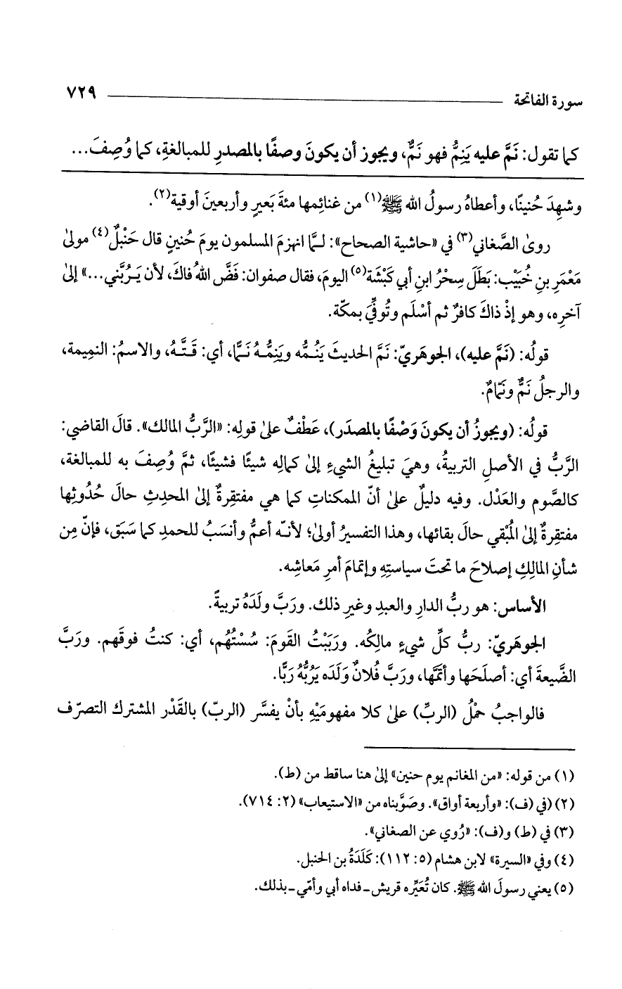 قوله: (ويجوز أن يكون وصفاً بالمصدر)، عطف على قوله: "الرب المالك". قال القاضي: الرب في الأصل التربية، وهي تبليغ الشيء إلى كماله شيئاً فشيئاً، ثم وصف به للمبالغة، كالصوم والعدل. وفيه دليل على أن الممكنات كما هي مفتقرة إلى المحدث حال حدوثها مفتقرة على المبقي حال بقائها، وهذا التفسير أولى؛ لأنه أعم وأنسب للحمد كما سبق، فإن من شأن المالك إصلاح ما تحت سياسته وإتمام أمر معاشه.
