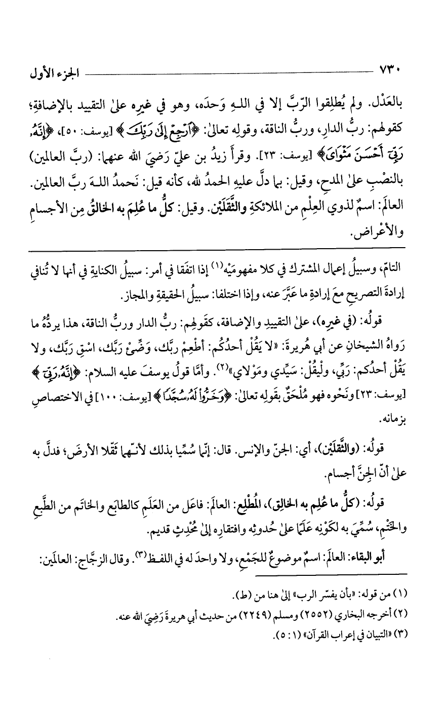 قوله: (في غيره)، على التقييد والإضافة، كقولهم: رب الدار ورب الناقة، هذا يرده ما رواه الشيخان عن أبي هريرة: "لا يقل أحدكم: أطعم ربك، وضيء ربك، اسق ربك، ولا يقل أحدكم: ربي، وليقل: سيدي ومولاي". وأما قول يوسف عليه السلام: (إِنَّهُ رَبِّي) [يوسف: 23] ونحوه فهو ملحق بقوله تعالى: (وَخَرُّوا لَهُ سُجَّداً) [يوسف: 100] في الاختصاص بزمانه.