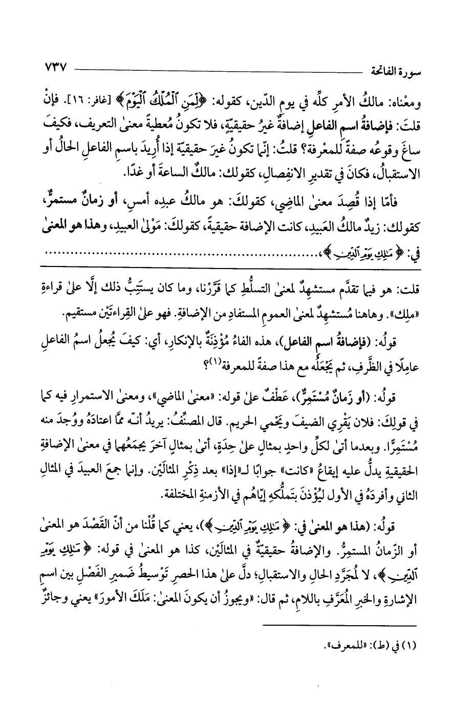 قوله: (هذا هو المعنى في: (مَالِكِ يَوْمِ الدِّينِ)، يعني كما قلنا من أن القصد هو المعنى أو الزمان المستمر. والإضافة حقيقية في المثالين، كذا هو المعنى في قوله: (مَالِكِ يَوْمِ الدِّينِ)، لا لمجرد الحال والاستقبال؛ دل على هذا الحصر توسيط ضمير الفصل بين اسم الإشارة والخبر المعرف باللام، ثم قال: "ويجوز أن يكون المعنى: مَلَكَ الأمور" يعني وجائز