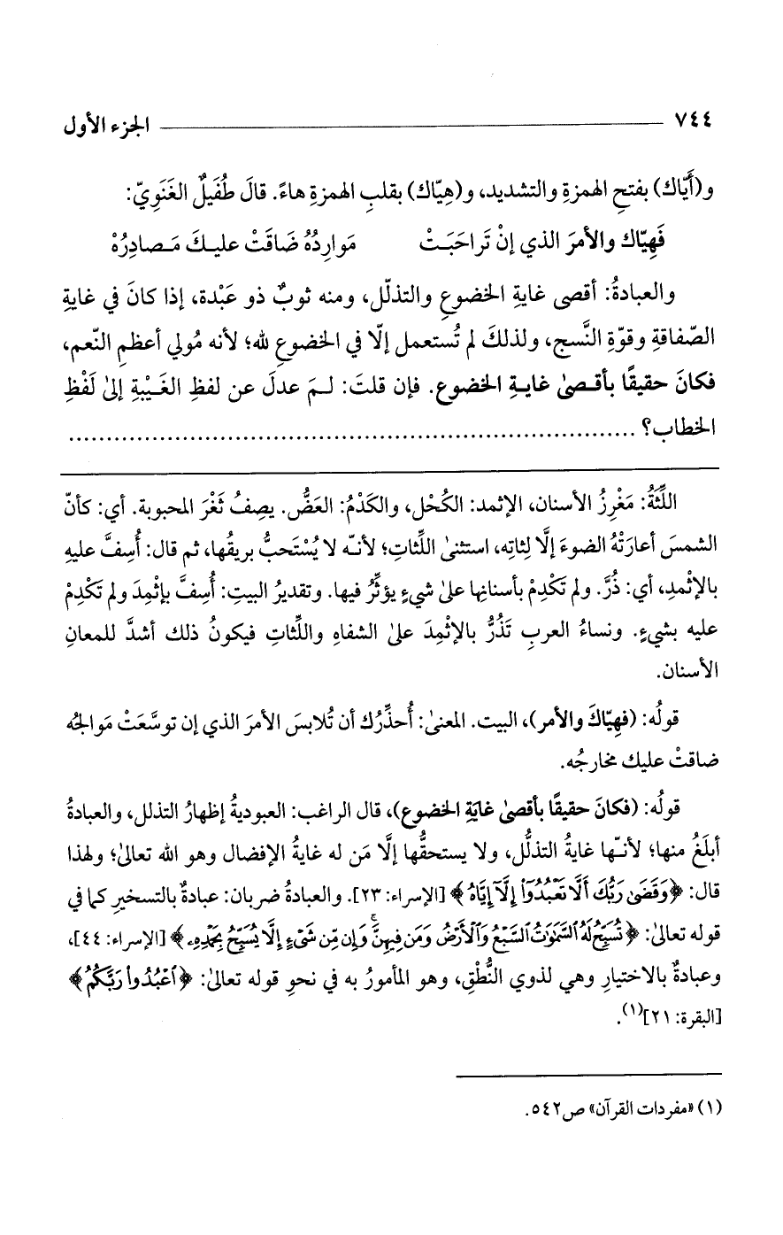 قوله: (فكان حقيقاً بأقصى غاية الخضوع)، قال الراغب: العبودية إظهار التذلل، والعبادة أبلغ منها، لأنها غاية التذلل، ولا يستحقها إلا من له غاية الإفضال وهو الله تعالى؛ ولهذا قال: (وَقَضَى رَبُّكَ أَلاَّ تَعْبُدُوا إِلاَّ إِيَّاهُ) [الإسراء: 23]. والعبادة ضربان: عبادة بالتسخير كما في قوله تعالى: (تُسَبِّحُ لَهُ السَّمَوَاتُ السَّبْعُ وَالأَرْضُ وَمَنْ فِيهِنَّ وَإِنْ مِنْ شَيْءٍ إِلاَّ يُسَبِّحُ بِحَمْدِهِ) [الإسراء: 44]، وعبادة بالاختيار وهي لذوي النطق، وهو المأمور به في نحو قوله تعالى: (اعْبُدُوا رَبَّكُمْ) [البقرة: 21].