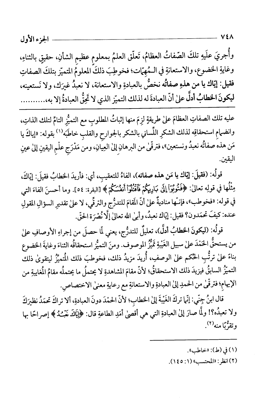 قال ابن جني: إنما ترك الغيبة إلى الخطاب؛ لأن الحمد دون العبادة، ألا تراك تحمد نظيرك ولا تعبده؟ ! ولما صار إلى العبادة التي هي أقصى أمد الطاعة قال: (إِيَّاكَ نَعْبُدُ) إصراحاً بها وتقرباً منه.