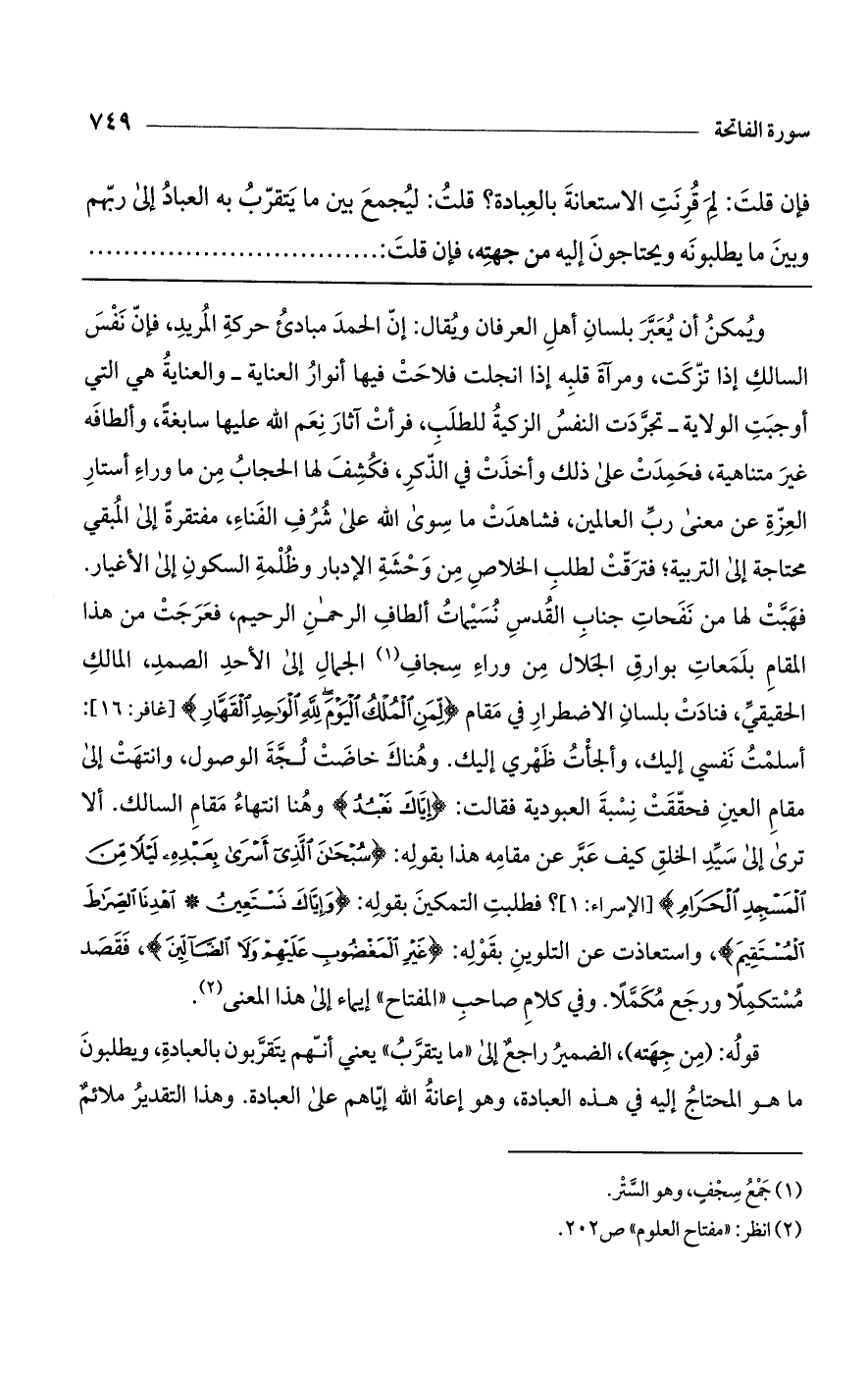 ويمكن أن يعبر بلسان أهل العرفان ويقال: إن الحمد مبادئ حركة المريد، فإن نفس السالك إذا تزكت، ومرآة قلبه إذا انجلت فلاحت فيها أنوار العناية- والعناية هي التي أوجبت الولاية- تجردت النفس الزكية للطلب، فرأت آثار نعم الله عليها سابغة، وألطافه غير متناهية، فحمدت على ذلك وأخذت في الذكر، فكشف لها الحجاب من ما وراء أستار العزة عن معنى رب العالمين، فشاهدت ما سوى الله على شرف الفناء، مفتقرة إلى المبقي محتاجة إلى التربية؛ فترقت لطلب الخلاص من وحشة الإدبار وظلمة السكون إلى الأغيار. فهبت لها من نفحات جناب القدس نسيمات ألطاف الرحمن الرحيم، فعرجت من هذا المقام بلمعات بوارق الجلال من وراء سجاف الجمال إلى الأحد الصمد، المالك الحقيقي، فنادت بلسان الاضطرار في مقام (لِمَنْ الْمُلْكُ الْيَوْمَ لِلَّهِ الْوَاحِدِ الْقَهَّارِ) [غافر: 16]: أسلمت نفسي إليك، وألجأت ظهري إليك. وهناك خاضت لجة الوصول، وانتهت إلى مقام العين فحققت نسبة العبودية فقالت: (إِيَّاكَ نَعْبُدُ) وهنا انتهاء مقام السالك. ألا ترى إلى سيد الخلق كيف عبر عن مقامه هذا بقوله: (سُبْحَانَ الَّذِي أَسْرَى بِعَبْدِهِ لَيْلاً مِنْ الْمَسْجِدِ الْحَرَامِ) [الإسراء: 1]؟ فطلبت التمكين بقوله: (وَإِيَّاكَ نَسْتَعِينُ* اهْدِنَا الصِّرَاطَ الْمُسْتَقِيمَ)، واستعاذت عن التلوين بقوله: (غَيْرِ الْمَغْضُوبِ عَلَيْهِمْ وَلا الضَّالِّينَ)، فقصد مستكملاً ورجع مكملاً. وفي كلام صاحب "المفتاح" إيماء إلى هذا المعنى.