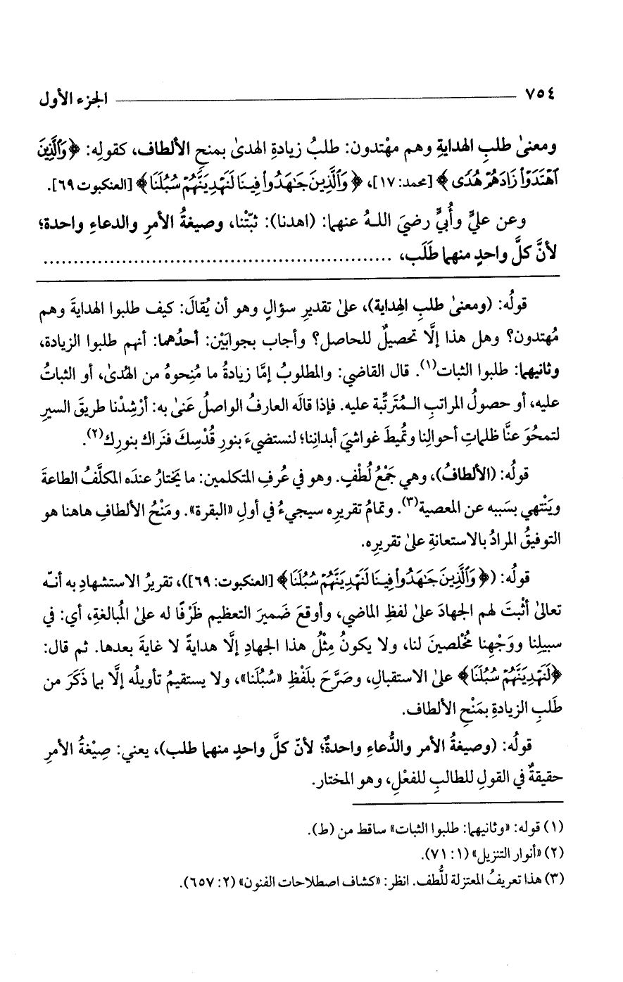 قوله: (وَالَّذِينَ جَاهَدُوا فِينَا لَنَهْدِيَنَّهُمْ سُبُلَنَا) [العنكبوت: 69]، تقرير الاستشهاد به أنه تعالى أثبت لهم الجهاد على لفظ الماضي، وأوقع ضمير التعظيم ظرفاً له على المبالغة، أي: في سبيلنا ووجهنا مخلصين لنا، ولا يكون مثل هذا الجهاد إلا هداية لا غاية بعدها. ثم قال: (لَنَهْدِيَنَّهُمْ سُبُلَنَا) على الاستقبال، وصرح بلفظ "سبلنا"، ولا يستقيم تأويله إلا بما ذكر من طلب الزيادة بمنح الألطاف.